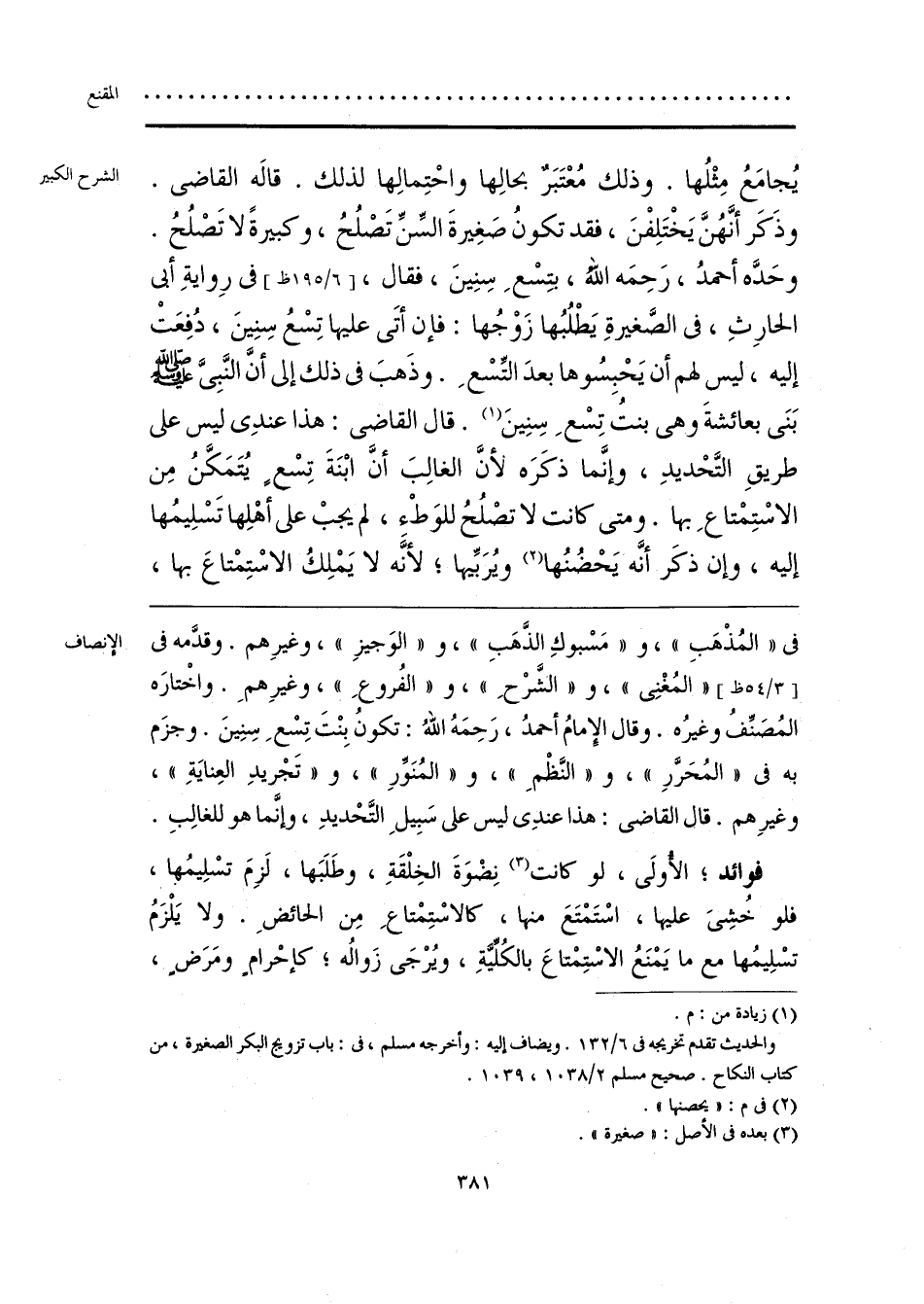 فى «المُذْهَبِ»، و «مَسْبوكِ الذَّهَبِ»، و «الوَجيزِ»، وغيرِهم. وقدَّمه فى «المُغْنِى»، و «الشَّرْحِ»، و «الفُروعِ»، وغيرِهمِ. واخْتارَه المُصَنِّفُ وغيرُه. وقال الإِمامُ أحمدُ، رَحِمَهُ اللَّهُ: تكون بِنْتَ تِسْعِ سِنِينَ. وجزَم به فى «المُحَرَّرِ»، و «النَّظْمِ»، و «المُنَوِّرِ»، و «تَجْريدِ العِنايَةِ»، وغيرِهم. قال القاضى: هذا عندِى ليس على سَبِيلِ التَّحْديدِ، وإِنَّما هو للغالِبِ.