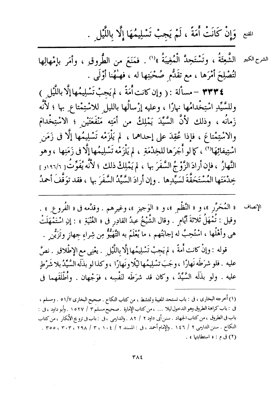 قوله: وإنْ كانت أَمةً، لم يَجِبْ تَسْلِيمُها إلَّا بِاللَّيْلِ. يعْنِى مع الإِطْلاقِ. نصَّ عليه. فلو شرَطَه نَهارًا، وجَبَ تسْلِيمُها ليْلًا ونَهارًا، وكذا لو بذَلَه السَّيِّدُ بلا شَرْطٍ عليه. ولو بذَلَه السَّيِّدُ، وكان قد شرَطَه لنَفْسِه، فوَجْهان. وأَطْلَقَهما فى