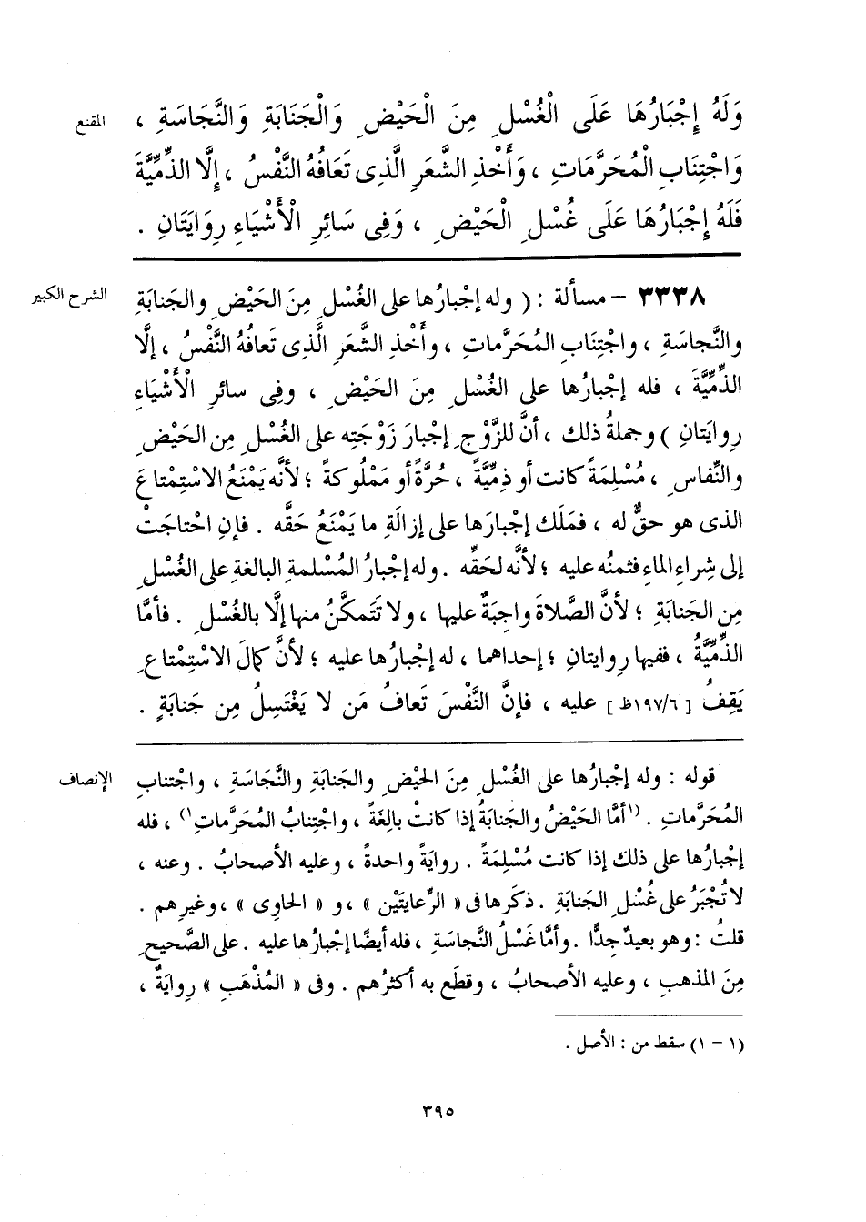قوله: وله إجْبارُها على الغُسْلِ مِنَ الحيْضِ والجَنابَةِ والنَّجَاسَةِ، واجْتنابِ المُحَرَّماتِ. [أمَّا الحَيْضُ والجَنابَةُ إذا كانتْ بالِغَةً، واجْتِنابُ المُحَرَّماتِ] (¬1)، فله إجْبارُها على ذلك إذا كانت مُسْلِمَةً. روايَةً واحدةً، وعليه الأصحابُ. وعنه، لا تُجْبَرُ على غُسلِ الجَنابَةِ. ذكَرها فى «الرِّعايتَيْن»، و «الحاوِى»، وغيرِهم. قلتُ: وهو بعيدٌ جِدًّا. وأمَّا غَسْلُ النَّجاسَةِ، فله أيضًا إجْبارُها عليه. على الصَّحيحِ مِنَ المذهبِ، وعليه الأصحابُ، وقطَع به أكثرُهم. وفى «المُذْهَبِ» رِوايَةٌ،