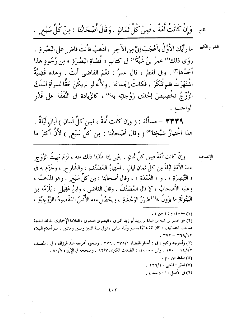 وإنْ كانت أمَةً فمِن كلِّ ثمانٍ. يعْنِى إذا طَلبَتا ذلك منه، لَزِمَ مَبِيتُ الزَّوْجِ عندَ الأمَةِ ليْلَةً مِن كلِّ ثَمانِ ليالٍ. اخْتِيارُ المُصَنِّف، والشَّارِحِ، وجزَم به فى «التَّبْصِرَةِ»، و «العُمْدَةِ»، وقال أصحابُنا: مِن كلِّ سَبْعٍ. وهو المذهبُ، وعليه الأصحابُ، كما قالَ المُصَنِّفُ. وقال القاضى، وابنُ عَقِيلٍ: يَلْزَمُه مِن البَيْتُوتَةِ ما يزُولُ به (¬1) ضَرَرُ الوَحْشَةِ، ويحْصُلُ معه الأُنْسُ المَقْصودُ بالزَّوْجِيَّةِ،