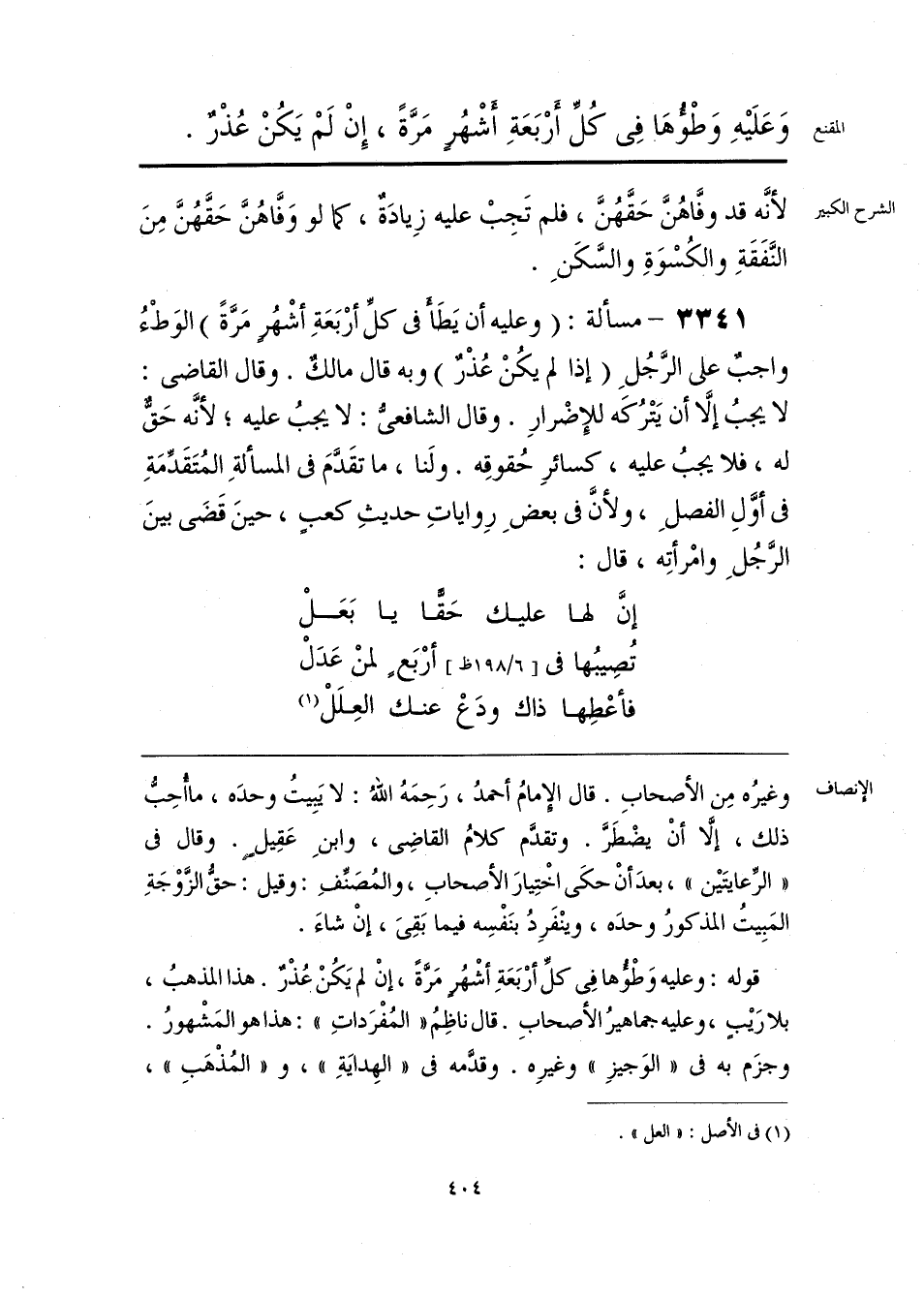 قوله: وعليه وَطْؤها فِى كلِّ أرْبَعَةِ أشْهُرٍ مَرَّةً، إنْ لم يَكُنْ عُذْرٌ. هذا المذهبُ، بلا رَيْب، وعليه جماهيرُ الأصحابِ. قال ناظِمُ «المُفْرَداتِ»: هذا هو المَشْهورُ. وجزَم به فى «الوَجيزِ» وغيرِه. وقدَّمه فى «الهِدايَةِ»، و «المُذْهَبِ»،