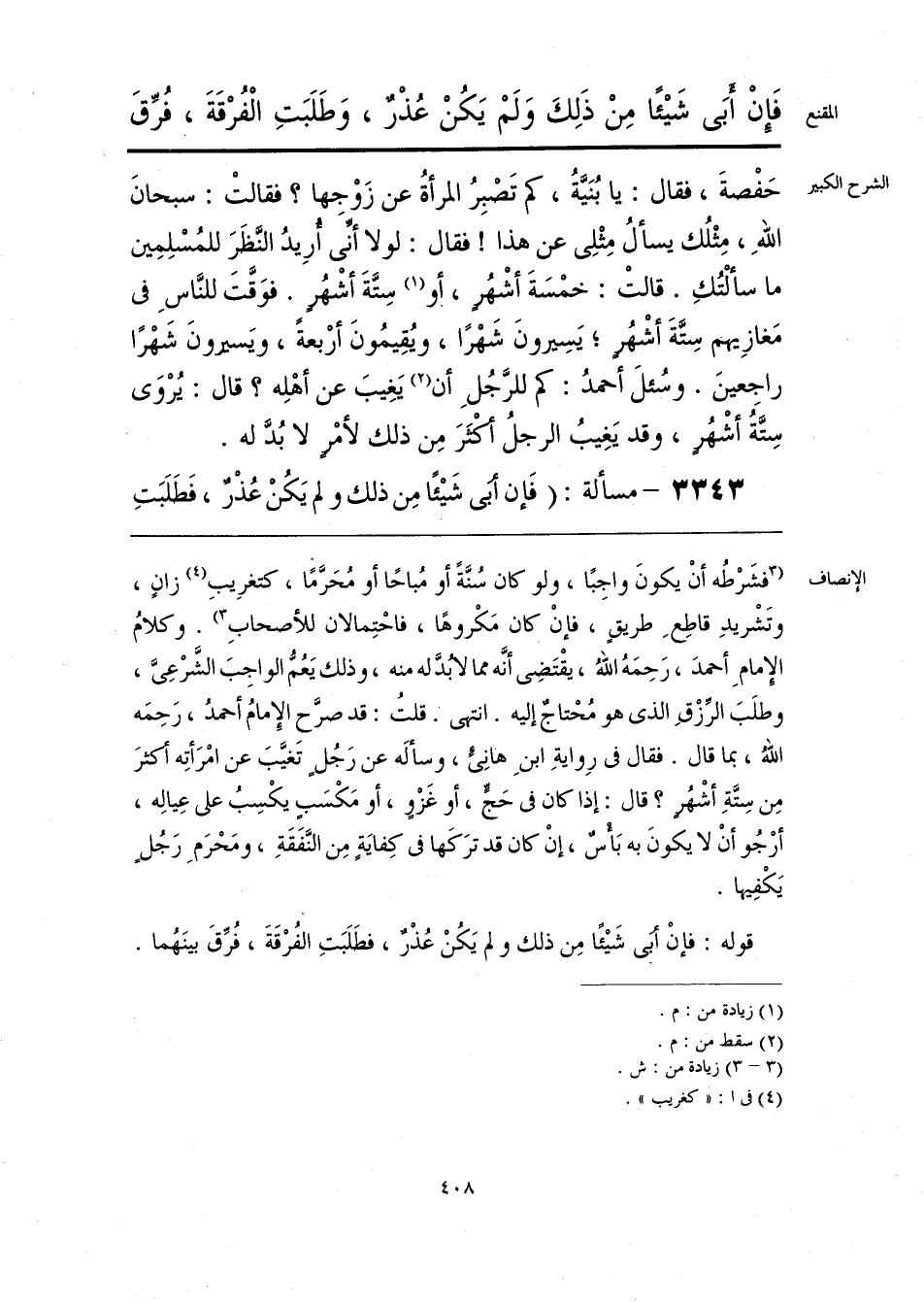 قوله: فإنْ أبى شَيْئًا مِن ذلك ولم يَكُنْ عُذْرٌ، فطَلَبَتِ الفُرْقَةَ، فُرِّقَ بينَهُما.