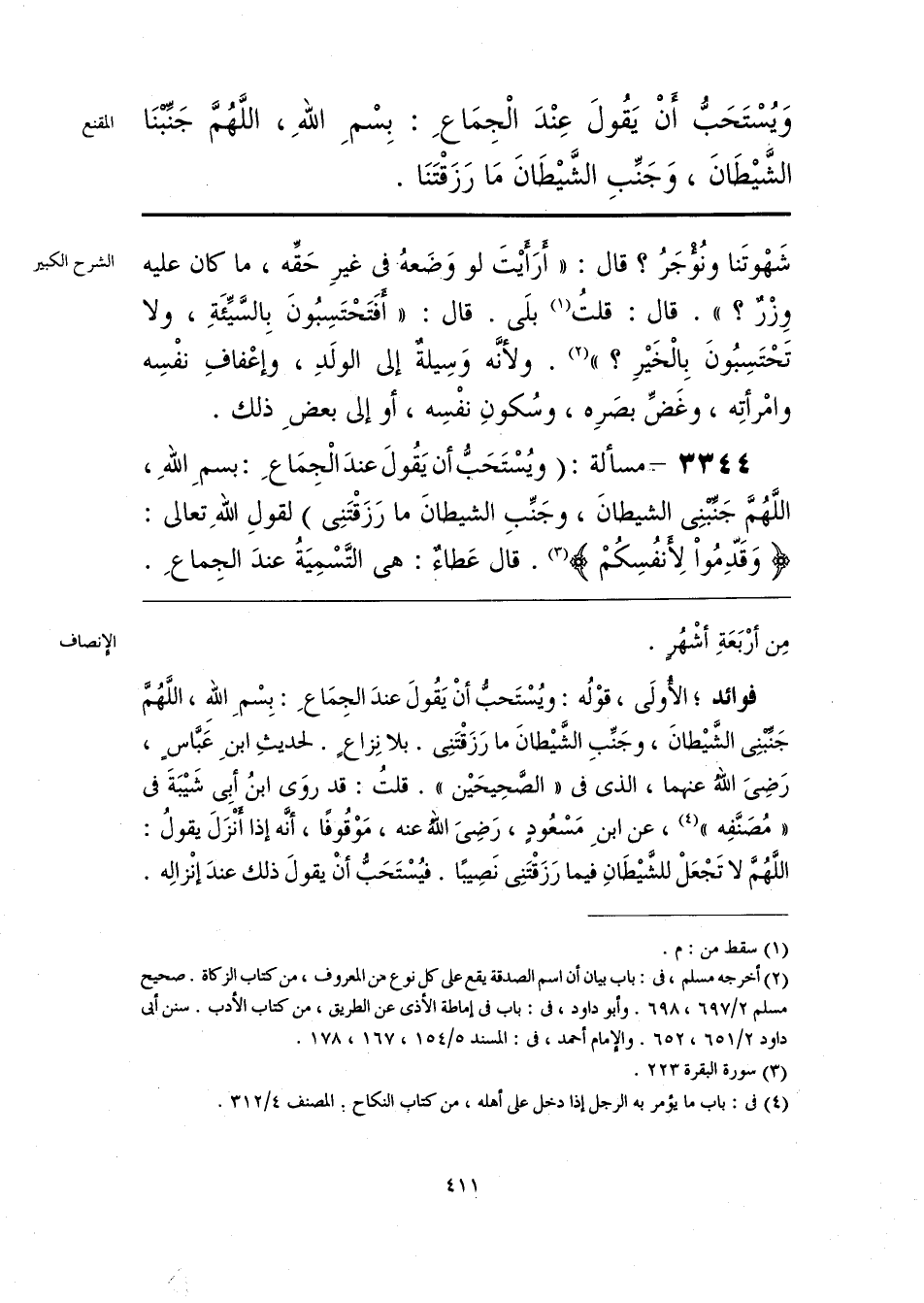 وَيُسْتَحَبُّ أَنْ يَقُولَ عِنْدَ الْجِمَاعِ: بِسْم اللَّهَ، اللَّهُمَّ جَنِّبْنَا الشَّيْطَانَ، وَجَنِّبِ الشَّيْطَانَ مَا رَزَقْتَنَا.