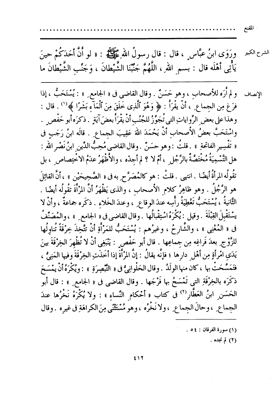 ولم أَرَه للأصحابِ، وهو حَسَنٌ. وقال القاضى فى «الجامعِ»: يُسْتَحَبُّ، إذا فرَغ مِن الجِماعِ، أَنْ يقْرَأ: {وَهُوَ الَّذِي خَلَقَ مِنَ الْمَاءِ بَشَرًا} (¬1). قال: وهذا على بعضِ الرِّواياتِ التى تُجَوِّزُ للجُنُبِ أَنْ يقْرَأَ بعضَ آيَةٍ. ذكرَه أبو حَفْصٍ. واسْتَحَبَّ بعضُ الأصحابِ أَنْ يَحْمَدَ اللَّهَ عَقِيبَ الجِماعِ. قالَه ابنُ رَجَبٍ فى «تَفْسِيرِ الفاتحةِ». قلتُ: وهو حسَن. وقال القاضى مُحِبُّ الدِّينِ ابنُ نَصْرِ اللَّهِ: هل التَّسْمِيَةُ مُخْتَصَّة بالرَّجُلِ، أمْ لا؟ لم أجِدْه، والأظْهَرُ عدَمُ الاخْتِصاصِ، بل تقُولُه المرأةُ أيضًا. انتهى. قلتُ: هو كالمُصَرَّحِ به فى «الصَّحِيحَيْن»، أنَّ القائِلَ هو الرَّجُلُ. وهو ظاهِرُ كلامِ الأصحابِ، والذى يَظْهَرُ أنَّ المرْأةَ تقُولُه أيضًا. الثَّانيةُ، يُسْتَحَبُّ تَغْطِيَةُ رأسِه عندَ الوِقاعِ، وعندَ الخَلاءِ. ذكَره جماعةٌ، وأنْ لا يسْتَقْبِلَ القِبْلَةَ. وقيل: يُكْرَهُ اسْتِقْبالُها. وقال القاضى فى «الجامعِ»، والمُصَنِّفُ فى «المُغْنِى»، والشَّارِحُ، وغيرُهم: يُسْتَحَبُّ للمَرْأة أَنْ تتَّخِذَ خِرْقَةً تُناوِلُها للزَّوْجِ بعدَ فَراغِه مِن جِماعِها. قال أبو حَفْصٍ: يَنْبَغِى أَنْ لا تُظْهِرَ الخِرْقَةَ بينَ يَدَىِ امْرأةٍ مِن أَهْلِ دارِها؛ فإنَّه يقالُ: إنَّ المرْأة إذا أخَذَتِ الخِرْقَةَ وفيها المَنِىُّ، فتَمَسَّحَتْ بها، كان منها الولَدُ. وقال الحَلْوانِىُّ فى «التَّبْصِرَةِ»: ويُكْرَهُ أَنْ يمْسَحَ ذكَرَه بالخِرْقَةِ التى تَمْسَحُ بها فَرْجَها. وقال القاضى فى «الجامعِ»: قال أبو الحَسَنِ ابنُ العَطَّارِ (¬2) فى كتاب «أَحْكامِ النِّساءِ»: ولا يُكْرَهُ نَخْرُها عندَ الجِماعِ، وحالَ الجِماعِ، ولا نَخْرُه، وهو مُسْتَثْنًى مِنَ الكراهَةِ فى غيرِه. وقال