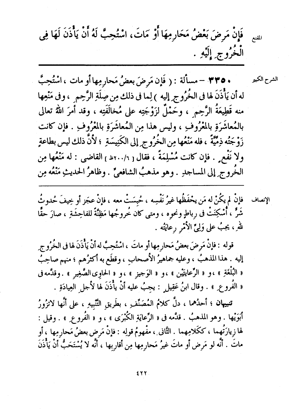 قوله: فإنْ مَرِضَ بعضُ مَحارِمِها أو ماتَ، اسْتُحِبَّ له أَنْ يَأذَنَ لها فى الخُرُوجِ إليه. هذا المذهبُ، وعليه جماهيرُ الأصحابِ، وقطَع به أكثرُهم؛ منهم صاحِبُ «البُلْغَةِ»، و «الرِّعايتَيْن»، و «الوَجيزِ»، و «الحاوِى الصَّغِيرِ». وقدَّمه فى «الفُروعِ». وقال ابنُ عَقِيلٍ: يجِبُ عليه أَنْ يأْذَنَ لها لأجلِ العِيادَةِ.