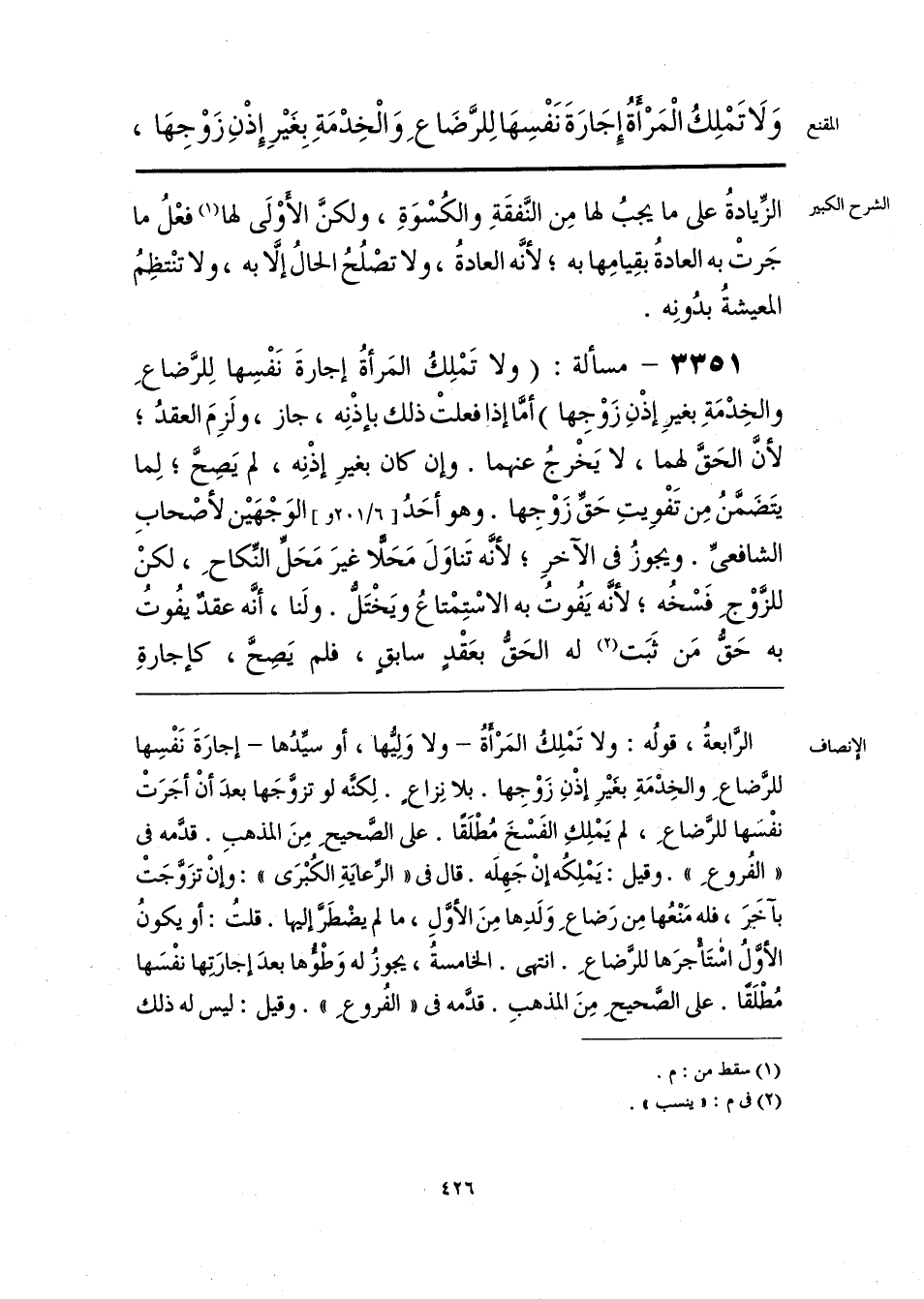 الرَّابعةُ، قولُه: ولا تَمْلِكُ المَرْأةُ -ولا وَلِيُّها، أو سيِّدُها- إجارَةَ نَفْسِها للرَّضاعِ والخِدْمَةِ بغيْرِ إذْنِ زَوْجِها. بلا نِزاعٍ. لِكنَّه لو تزوَّجَها بعدَ أَنْ أجَرَتْ نفْسها للرضاعِ، لم يَمْلِكِ الفَسْخَ مُطْلَقًا. على الصَّحيحِ مِنَ المذهبِ. قدَّمه فى «الفُروعِ». وقيل: يَمْلِكُه إنْ جَهِلَه. قال فى «الرِّعايَةِ الكُبْرَى»: وإنْ تزَوَّجَتْ بآخر، فله مَنْعُها مِن رَضاعِ وَلَدِها مِنَ الأَوَّلِ، ما لم يضْطرَّ إليها. قلتُ: أو يكونُ الأولُ اسْتَأجرَها للرضاعِ. انتهى. الخامسةُ، يجوزُ له وَطْؤها بعدَ إجارَتِها نفْسَها مُطْلَقًا. على الصَّحيحِ مِنَ المذهبِ. قدَّمه فى «الفُروعِ». وقيل: ليس له ذلك
