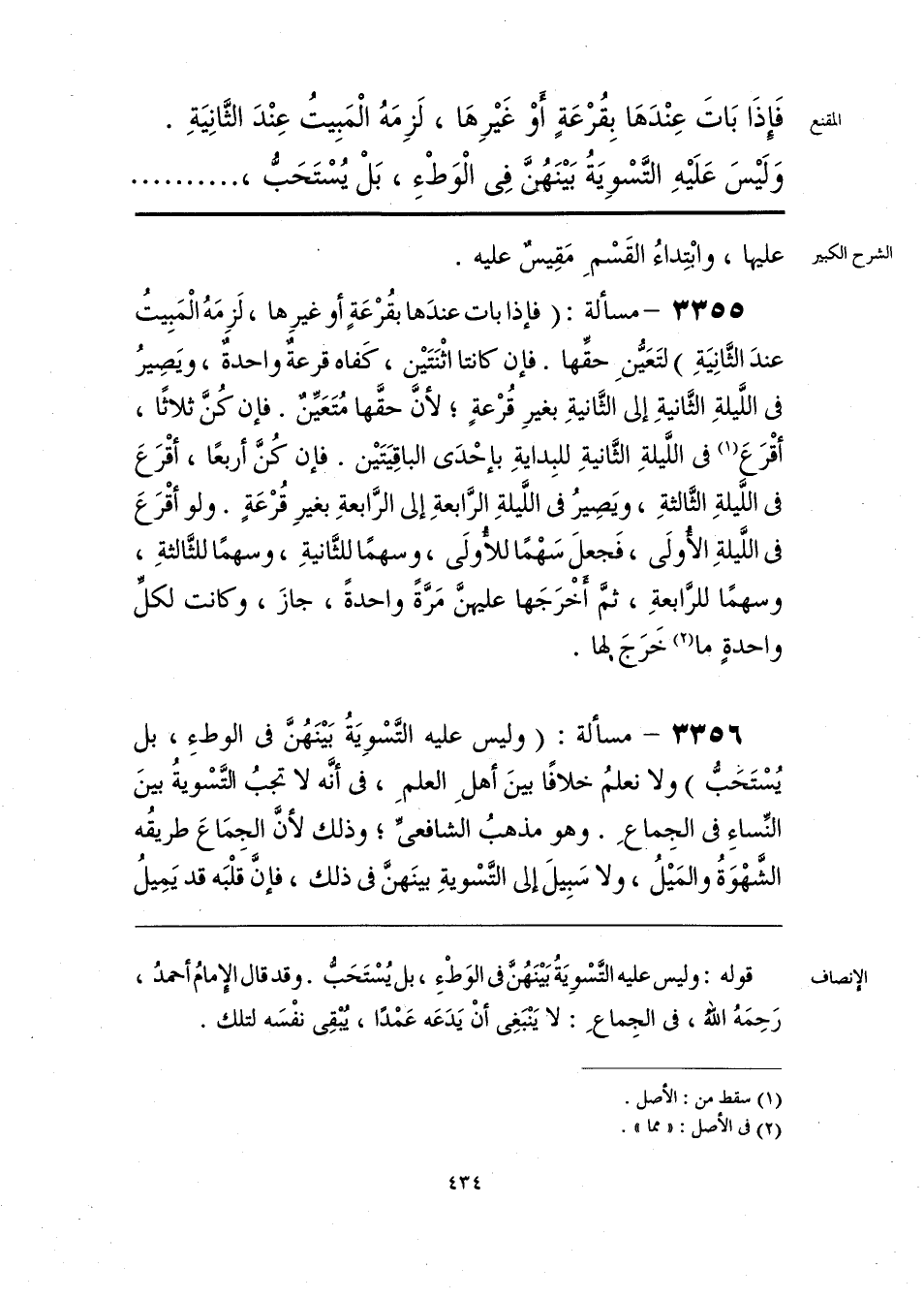 قوله: وليس عليه التَّسْوِيَةُ بَيْنَهُنَّ فى الوَطْءِ، بل يُسْتَحَبُّ. وقد قال الإِمامُ أحمدُ، رَحِمَهُ اللَّه، فى الجِماعِ: لا يَنْبَغِى أَنْ يَدَعَه عَمْدًا، يُبقِى نفْسَه لتلك.