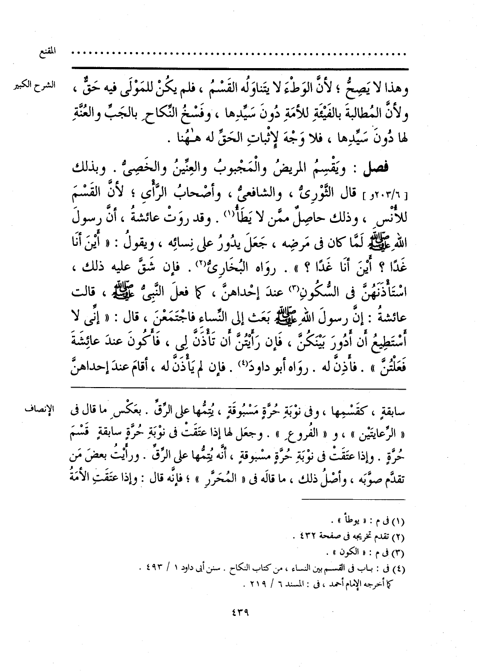 سابقةٍ، كقَسْمِها، وفى نوْبَةِ حُرَّةٍ مَسْبُوقَةٍ، يُتمُّها على الرِّقِّ. بعَكْسِ ما قال فى «الرِّعايتَيْن»، و «الفُروعِ». وجعَل لها إذا عتَقَتْ فى نوْبَةِ حُرَّةٍ سابقةٍ قَسْمَ حُرَّةٍ. وإذا عتَقَتْ فى نوْبَةِ حُرَّةٍ مسْبوقةٍ، أنَّه يُتمُّها على الرِّق. ورأَيْتُ بعضَ مَن تقدَّم صوَّبَه، وأصْلُ ذلك، ما قالَه فى «المُحَرَّرِ»؛ فإنَّه قال: وإذا عتَقَتِ الأمَة
