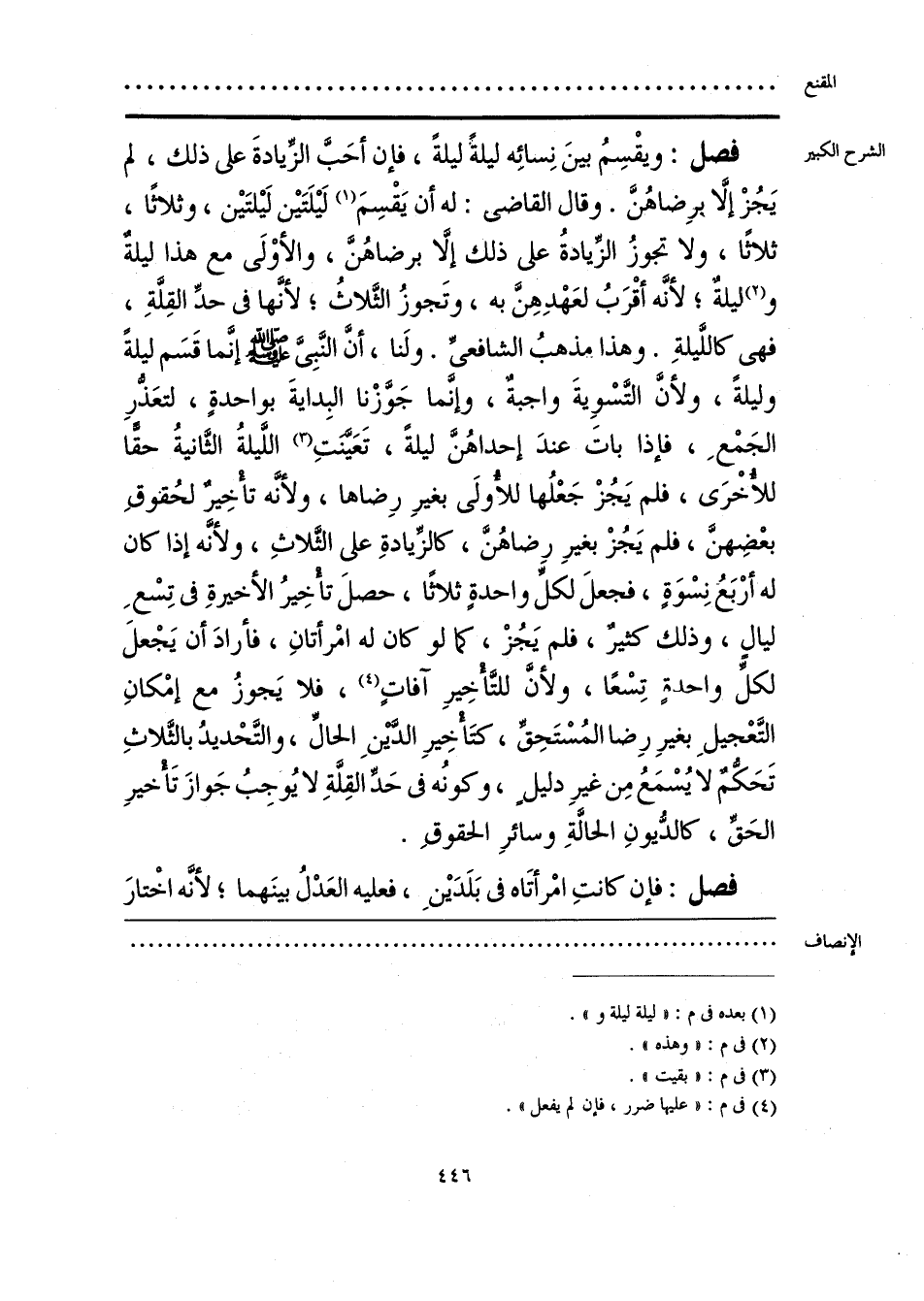 فصل: ويقْسِمُ بينَ نِسائه ليلةً ليلةً، فإن أحَبَّ الزِّيادةَ على ذلك، لم يَجُزْ إلَّا برضاهُنَّ. وقال القاضى: له أن يَقْسِمَ (¬1) لَيْلَتَيْن لَيْلتَيْن، وثلاثًا، ثلاثًا، ولا تجوزُ الزِّيادةُ على ذلك إلا برضاهُنَّ، والأَوْلَى مع هذا ليلة و (¬2) ليلةٌ؛ لأنَّه أقْرَبُ لعَهْدِهِنَّ به، وتَجوزُ الثَّلاثُ؛ لأنَّها في حدِّ القِلَّةِ، فهى كاللَّيلةِ. وهذا مذهبُ الشافعىِّ. ولَنا، أنَّ النَّبِىَّ -صلى اللَّه عليه وسلم- إنَّما قَسَم ليلةً وليلةً، ولأَنَّ التَّسْوِيةَ واجبةٌ، وإنما جَوَّزْنا البِدايةَ بواحدةٍ، لتعَذُّر الجَمْعِ، فإذا باتَ عندَ إحداهُنَّ ليلةً، تَعَينَّتَ (¬3) اللَّيلةُ الثَّانيةُ حقًّا للأُخْرَى، فلم يَجُزْ جَعْلها للأُولى بغيرِ رِضاها، ولأنه تأْخِيرٌ لحُقوقِ بعْضِهنَّ، فلم يَجُزْ بغيرِ رضاهُنَّ، كالزِّيادةِ على الثَّلاثِ، ولأنَّه إذا كان له أرْبَعُ نِسْوَةٍ، فجعلَ لكلِّ واحدةٍ ثلاثًا، حصلَ تأْخِيرُ الأخيرةِ في تِسْعِ ليالٍ، وذلك كثيرٌ، فلم يَجُزْ، كما لو كان له امْرأتانِ، فأرادَ أن يَجْعلَ لكلِّ واحدةٍ تِسْعًا، ولأَنَّ للتَّأْخِيرِ آفاتٍ (¬4)، فلا يَجوزُ مع إمْكانِ التَّعْجيلِ بغيرِ رِضا المُسْتَحِقِّ، كتَأْخِيرِ الدَّيْنِ الحالِّ، والتَّحْديدُ بالثَّلاثِ تَحَكُّمٌ لا يُسْمَعُ مِن غيرِ دليلٍ، وكونُه في حَدِّ القِلَّةِ لا يُوجِبُ جَوازَ تَأْخيرِ الحَقِّ، كالدُّيونِ الحالَّةِ وسائرِ الحقوقِ.