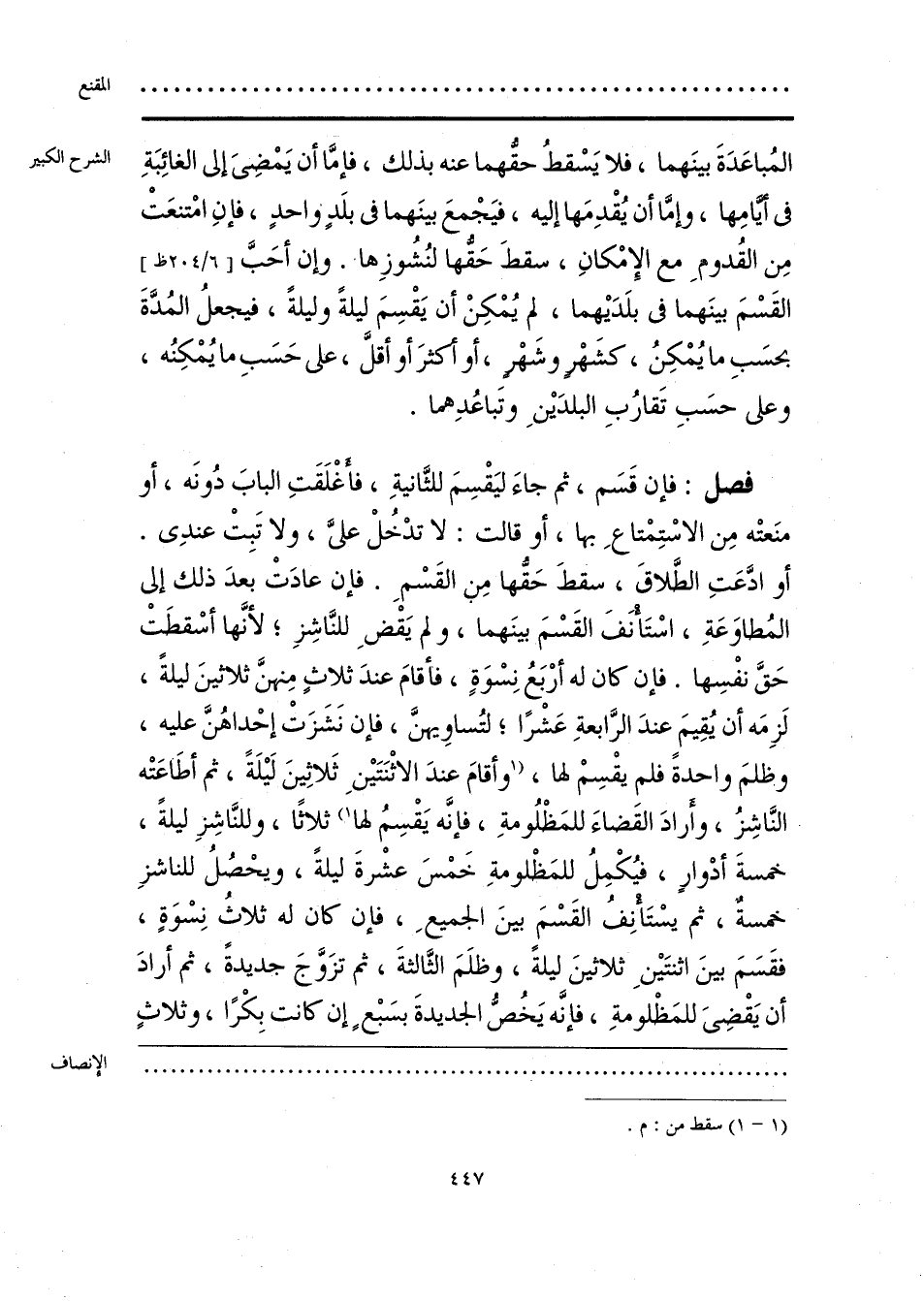 المُباعَدَةَ بينَهما، فلا يَسْقطُ حقُّهما عنه بذلك، فإمَّا أن يَمْضِىَ إلى الغائِبَةِ في أيَّامِها، وإمَّا أن يُقْدِمَها إليه، فيَجْمعَ بينَهما في بلَدٍ واحدٍ، فإنِ امْتنعَتْ مِن القُدومِ مع الإِمْكانِ، سقطَ حَقُّها لنُشُوزِها. وإن أحَبَّ القَسْمَ بينَهما في بلَدَيْهما، لم يُمْكِنْ أن يَقْسِمَ ليلةً وليلةً، فيجعلُ المُدَّةَ بحَسَبِ ما يُمْكِنُ، كشَهْرٍ وشَهْرٍ، أو أكثرَ أو أقلَّ، على حَسَبِ ما يُمْكِنُه، وعلى حسَبِ تَقارُبِ البلدَيْنِ وتَباعُدِهما.