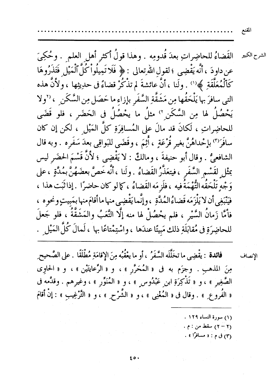 فائدة: يقْضِى ما تخَلَّلَه السَّفَرُ، أو ما يعْقُبُه مِنَ الإِقامَةِ مُطْلَقًا. على الصَّحيحِ مِنَ المذهبِ. وجزَم به فى «المُحَرَّرِ»، و «الرِّعايتَيْن»، و «الحاوِى الصَّغِيرِ»، و «تَذْكِرَةِ ابنِ عَبْدُوسٍ»، و «المُنَوِّرِ»، وغيرِهم. وقدَّمه فى «الفُروعِ». وقال فى «المُغْنِى»، و «الشَّرْحِ»، و «التَّرْغِيبِ»: إنْ أقامَ