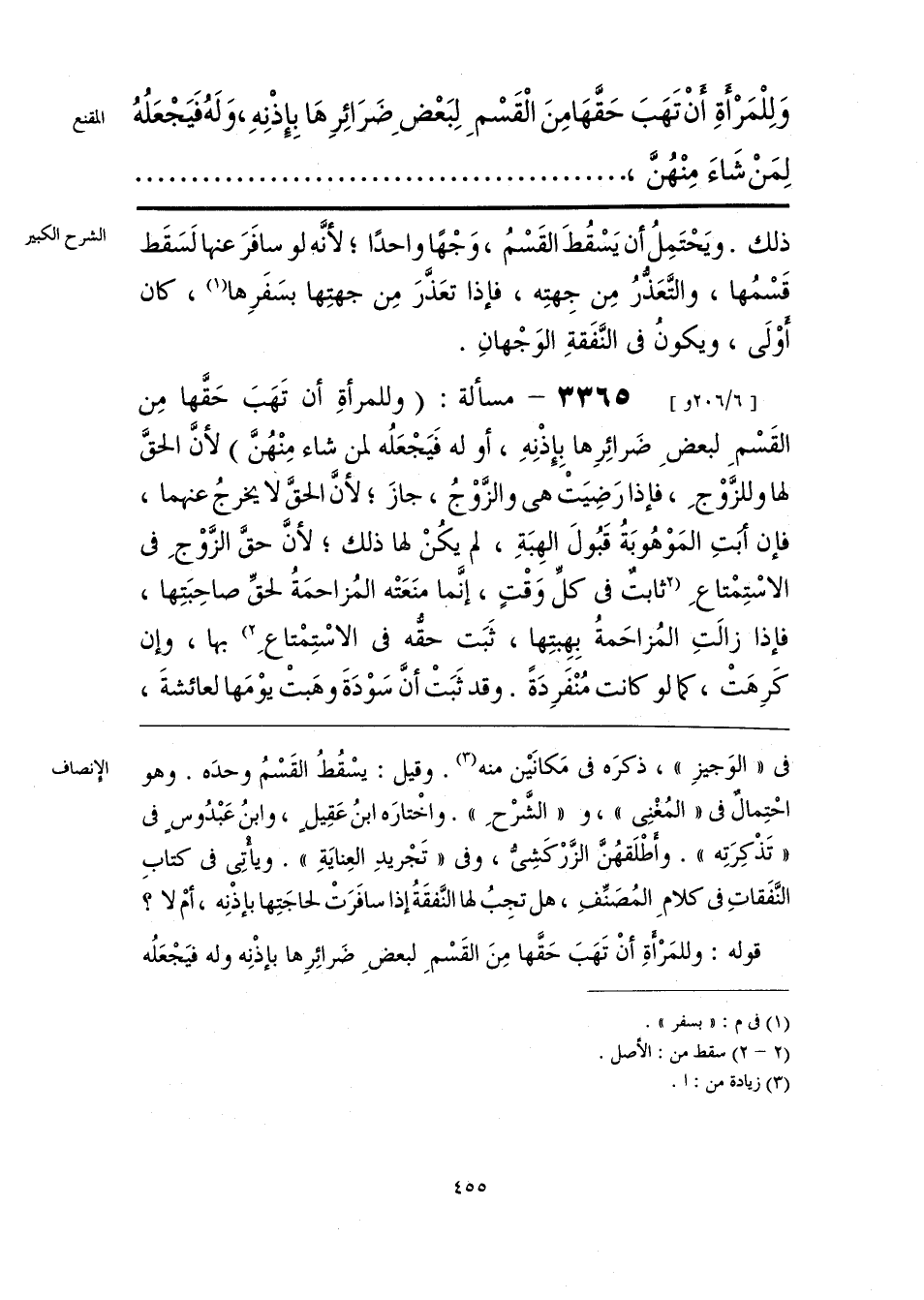 فى «الوَجيزِ»، ذكرَه فى مَكانَيْن منه (¬1). وقيل: يسْقُطُ القَسْمُ وحدَه. وهو احْتِمالٌ فى «المُغْنِى»، و «الشَّرْحِ». واخْتارَه ابنُ عَقِيلٍ، وابنُ عَبْدُوسٍ فى «تَذْكِرَتِه». وأَطْلَقهُنَّ الزَّرْكَشِىُّ، وفى «تَجْريدِ العِنايَةِ». ويأْتِى فى كتابِ النَّفَقاتِ فى كلامِ المُصَنِّفِ، هل تجِبُ لها النَّفقَةُ إذا سافَرَتْ لحاجَتِها بإذْنِه، أمْ لا؟