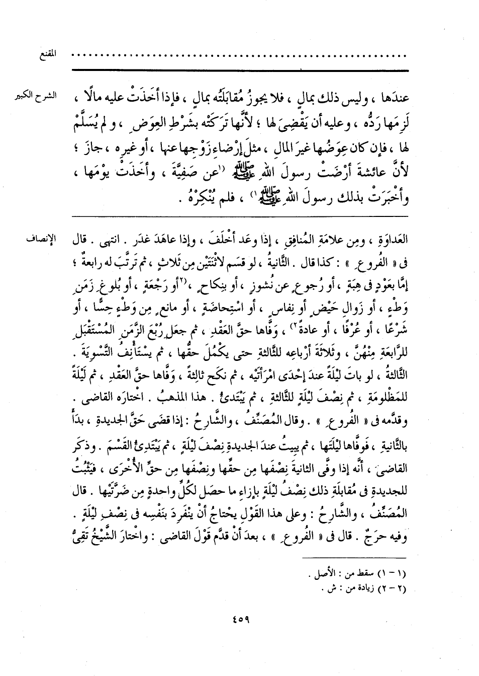 العَداوَةِ، ومِن علامَةِ المُنافِقِ، إذا وعَد أخْلَفَ، وإذا عاهَدَ غدَر. انتهى. قال فى «الفُروعِ»: كذا قال. الثَّانيةُ، لو قسَم لاثْنَتَيْن مِن ثَلاثٍ، ثم تَرتَّبَ له رابعة؛ إمَّا بعَوْدٍ فى هِبَةٍ، أو رُجوعٍ عن نُشوزٍ، أو بنِكاحٍ، [أو رَجْعَةٍ، أو بُلوغِ زَمَنِ وَطْءٍ، أو زَوالِ حَيْضٍ أو نِفاسٍ، أو اسْتِحاضَةٍ، أو مانعٍ مِن وَطْءٍ حِسًّا، أو شَرْعًا، أو عُرْفًا، أو عادةً] (¬1)، وَفَّاها حقَّ العَقْدِ، ثم جعَل رُبْعَ الزَّمَنِ المُسْتَقْبَلِ للرَّابعَةِ مِنْهُنَّ، وثَلَاثَةَ أرْباعِه للثَّالثةِ حتَّى يكْمُلَ حقُّها، ثم يسْتَأْنِفُ التَّسْوِيَةَ. الثَّالثةُ، لو باتَ ليْلَةً عندَ إحْدَى امْرَأتَيْه، ثم نَكَح ثالِثةً، وَفَّاها حقَّ العَقْدِ، ثم لَيْلَةً للمَظْلومَةِ، ثم نِصْفَ ليْلَةٍ للثَّالثةِ، ثم يَبْتَدئُ. هذا المذهبُ. اخْتارَه القاضى. وقدَّمه فى «الفُروعِ». وقال المُصَنِّفُ، والشَّارِحُ: إذا قضَى حَقَّ الجديدةِ، بدَأَ بالثَّانيةِ، فَوفَّاها ليْلَتَها، ثم يبِيتُ عندَ الجديدةِ نِصْفَ ليْلَةٍ، ثم يَبْتَدئُ القَسْمَ. وذكَر القاضى، أنَّه إذا وفَّى الثَّانيةَ نِصْفَها مِن حقِّها ونِصْفَها مِن حقِّ الأُخْرَى، فيَثْبُت للجديدةِ فى مُقابلَةِ ذلك نِصْفُ ليْلَةٍ بإزاءِ مما حصَل لكُلِّ واحدةٍ مِن ضَرَّتَيْها. قال المُصَنِّفُ، والشَّارِحُ: وعلى هذا القَوْلِ يحْتاجُ أَنْ ينْفَرِدَ بنَفْسِه فى نِصْفِ ليْلَةٍ. وفيه حرَجٌ. قال فى «الفُروعِ»، بعدَ أَنْ قدَّم قَوْلَ القاضى: واختارَ الشَّيْخُ تَقِىُّ