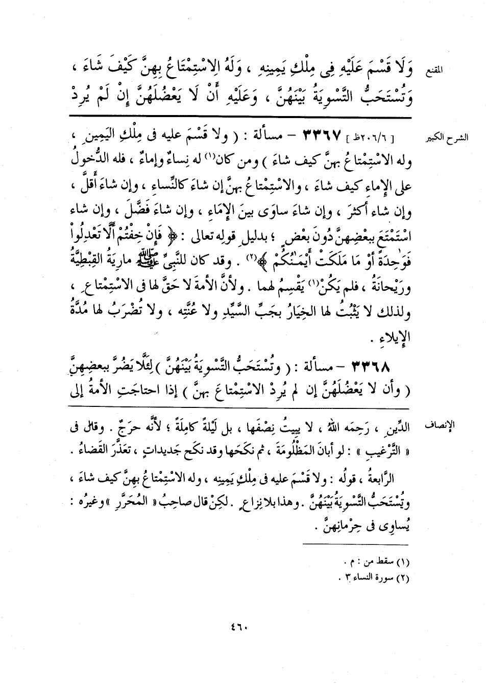 الدِّينِ، رَحِمَه اللَّهُ، لا يبيتُ نِصْفَها، بل لَيْلةً كامِلَةً، لأنَّه حرَجٌ. وقال فى «التَّرْغيبِ»: لو أبانَ المَظْلُومَةَ، ثم نكَحَها وقد نكَح جَديداتٍ، تعَذَّرَ القَضاءُ. الرَّابعةُ، قولُه: ولا قَسْمَ عليه فى مِلْكِ يَمِينِه، وله الاسْتِمْتاعُ بهِنَّ كيف شاءَ، ويُسْتَحَبُّ التَّسْويَةُ بَيْنَهُنَّ. وهذا بلا نِزاعٍ. لكِنْ قال صاحِبُ «المُحَرَّرِ» وغيرُه: يُساوِى فى حِرْمانِهنَّ.