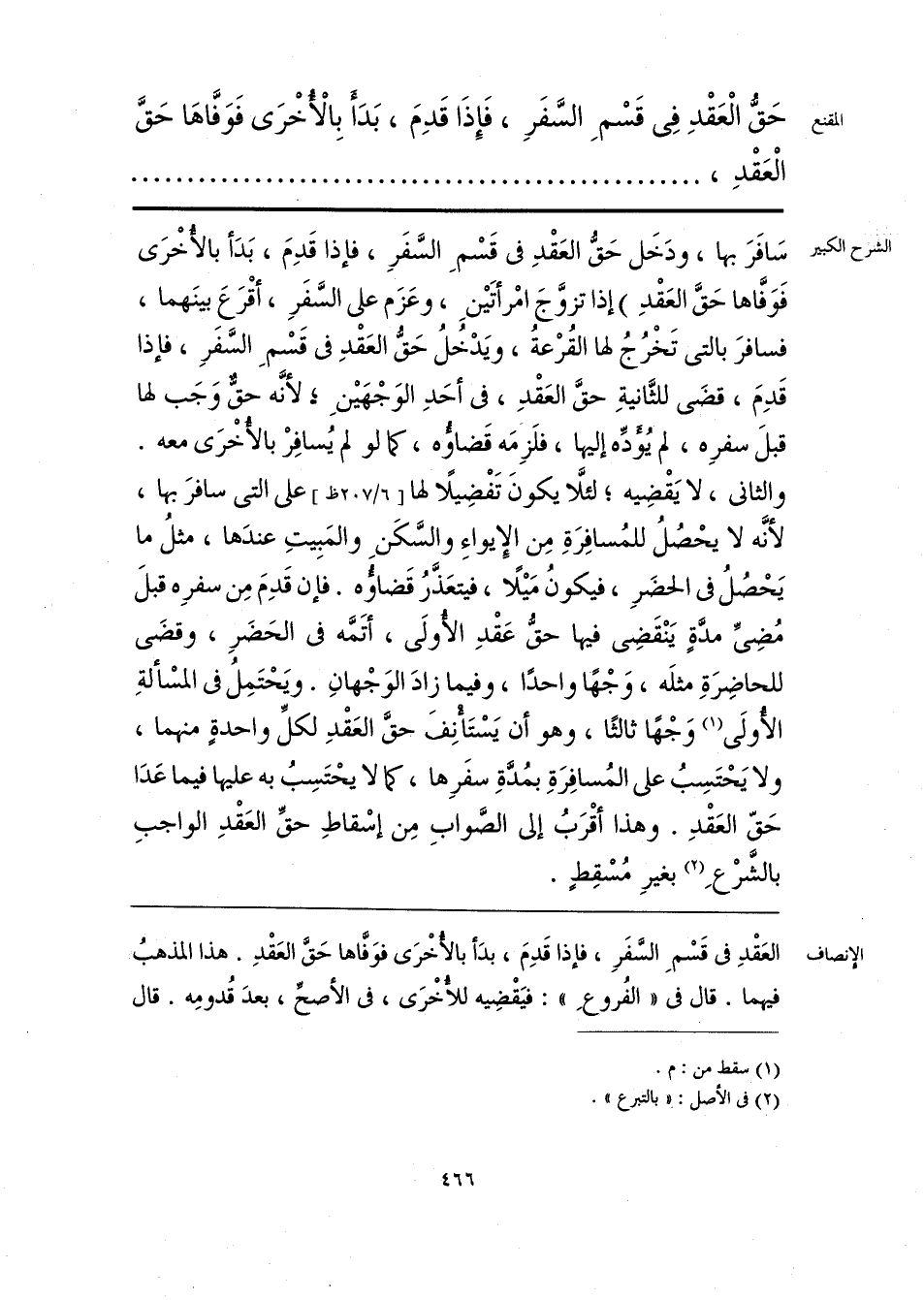 العَقْدِ فى قَسْمِ السَّفَرِ، فإذا قَدِمَ، بدَأ بالأُخْرَى فوَفَّاها حَقَّ العَقْدِ. هذا المذهبُ فيهما. قال فى «الفُروعِ»: فيَقْضِيه للأُخْرَى، فى الأصحِّ، بعدَ قُدومِه. قال