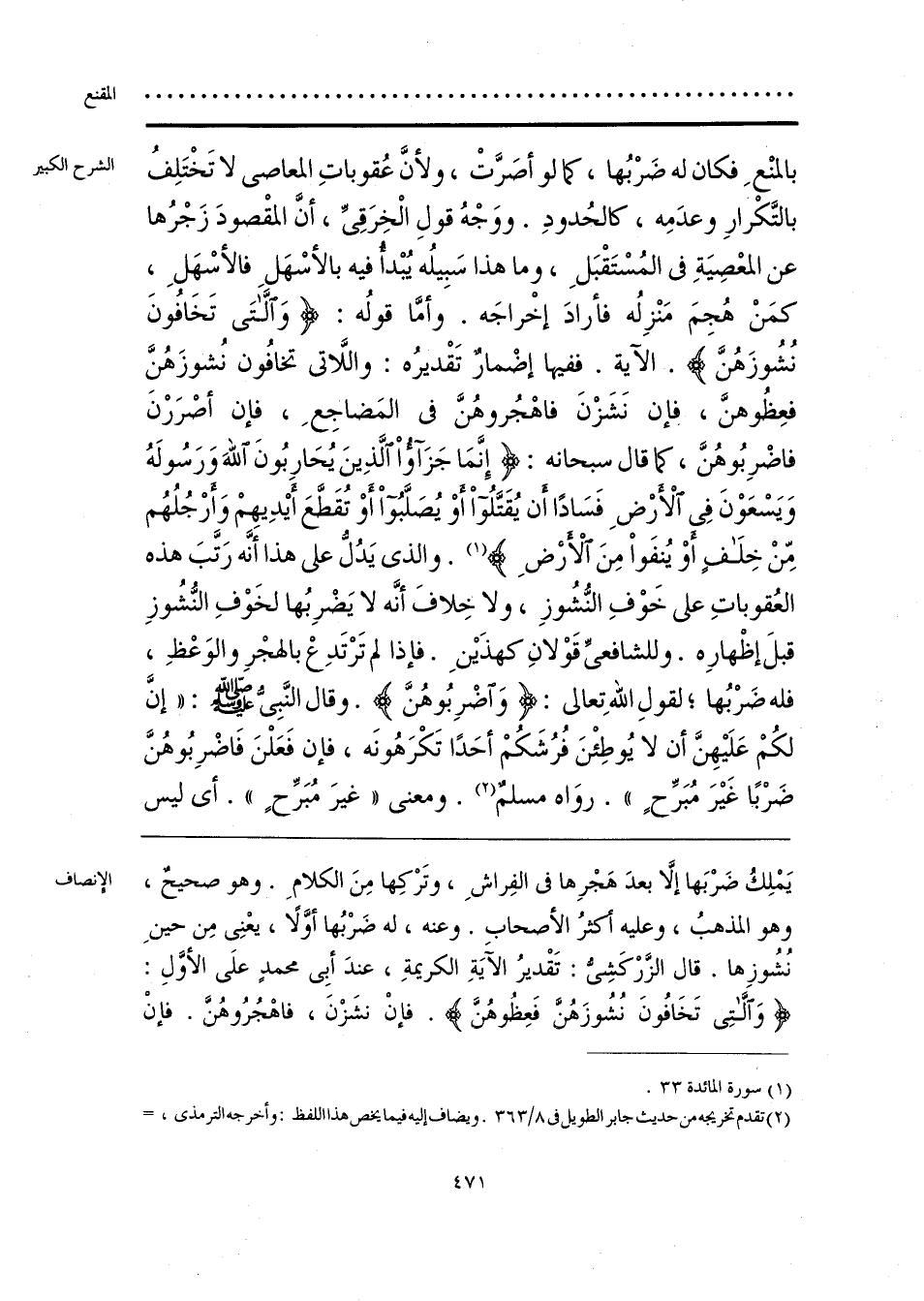 يَمْلِكُ ضَرْبَها إلَّا بعدَ هَجْرِها فى الفِراشِ، وتَرْكِها مِنَ الكلامِ. وهو صحيحٌ، وهو المذهبُ، وعليه أكثرُ الأصحاب. وعنه، له ضَرْبُها أوَّلًا، يعْنِى مِن حينِ نُشُوزِها. قال الزَّرْكَشِىُّ: تقْديرُ الآيَةِ الكريمةِ، عندَ أَبى محمدٍ علَى الأَوَّلِ: {وَاللَّاتِي تَخَافُونَ نُشُوزَهُنَّ فَعِظُوهُنَّ}. فإنْ نشَزْن، فاهْجُرُوهُنَّ. فإنْ