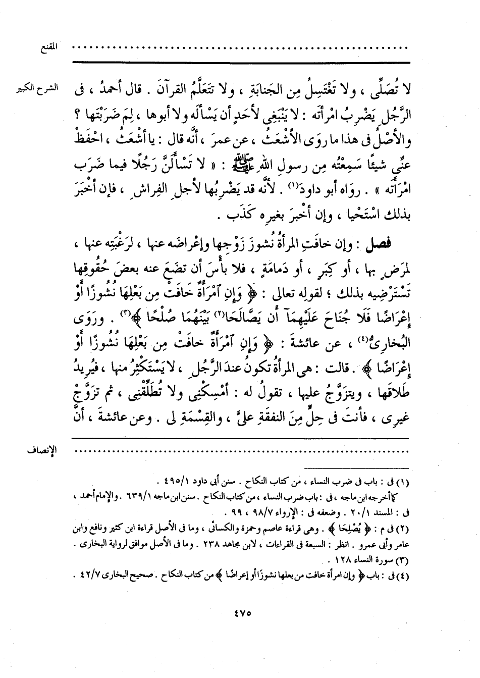لا تصَلِّى، ولا تَغْتَسِلُ مِن الجَنابَةِ، ولا تتَعَلَّمُ القرآنَ. قال أحمدُ، في الرَّجُلِ يَضْرِبُ امْرأتَه: لا يَنْبَغِى لأحَدٍ أن يَسْألَه ولا أبوها، لِمَ ضَرَبْتَها؟ والأَصْلُ في هذا ما روَى الأشْعَثُ، عن عمرَ، أنَّه قال: يا أشْعَثُ، احْفَظْ عنِّى شيئًا سَمِعْتُه مِن رسولِ اللَّهِ -صلى اللَّه عليه وسلم-: «لا تَسْأَلَنَّ رَجُلًا فيما ضَرَب امْرَأَتَه». روَاه أبو داودَ (¬1). لأنَّه قد يَضْرِ بُها لأجلِ الفِراشِ، فإن أخْبَرَ بذلك اسْتَحْيا، وإن أخْبرَ بغيرِه كَذَب.