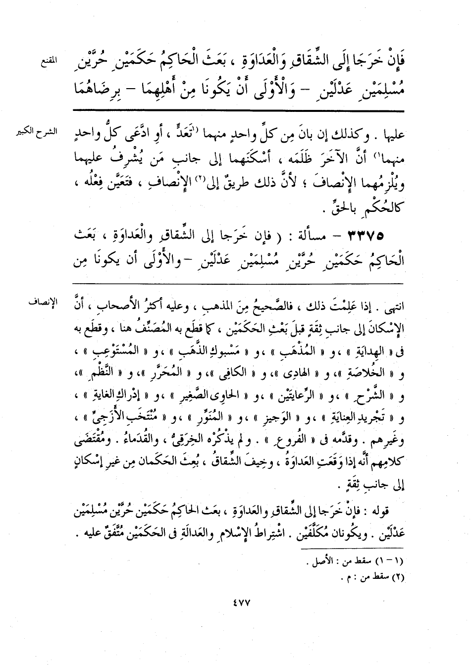 قوله: فإنْ خَرَجا إلى الشِّقاقِ والعَداوَةِ، بعَث الحاكِمُ حَكَمَيْن حُرَّيْن مُسْلِمَيْن عَدْلَيْن. ويكُونان مُكَلَّفَيْن. اشْتِراطُ الإِسْلامِ والعَدالَةِ فى الحَكَمَيْن مُتَّفَقٌ عليه.