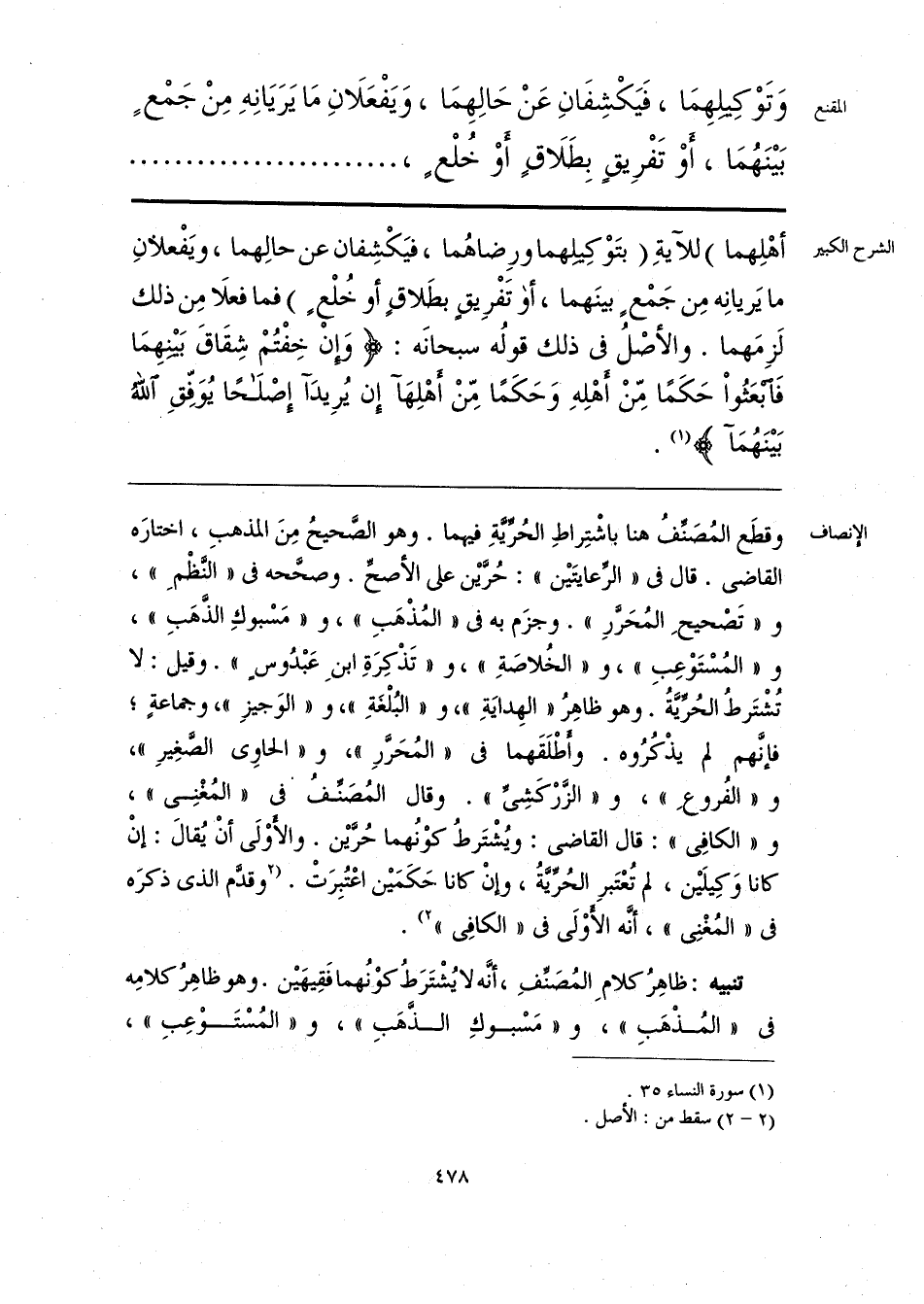 وقطَع المُصَنِّفُ هنا باشْتِراطِ الحُرِّيَّةِ فيهما. وهو الصَّحيحُ مِنَ المذهبِ، اختارَه القاضى. قال فى «الرِّعايتَيْنِ»: حُرَّيْن على الأصحِّ. وصحَّحه فى «النَّظْمِ»، و «تَصْحيحِ المُحَرَّرِ». وجزَم به فى «المُذْهَبِ»، و «مَسْبوكِ الذَّهَبِ»، و «المُسْتَوْعِبِ»، و «الخُلاصَةِ»، و «تَذْكِرَةِ ابنِ عَبْدُوسٍ». وقيل: لا تُشْتَرطُ الحُرِّيَّةُ. وهو ظاهِرُ «الهِدايَةِ»، و «البُلْغَةِ»، و «الوَجيزِ»، وجماعةٍ؛ فإنَّهم لم يذْكُرُوه. وأطْلَقَهما فى «المُحَرَّرِ»، و «الحاوِى الصَّغِيرِ»، و «الفُروعِ»، و «الزَّرْكَشِىِّ». وقال المُصَنِّفُ فى «المُغْنِى»، و «الكافِى»: قال القاضى: ويُشْتَرطُ كوْنُهما حُرَّيْن. والأَوْلَى أَنْ يُقالَ: إنْ كانا وَكِيلَيْن، لم تُعْتَبرِ الحُرِّيَّةُ، وإنْ كانا حَكَمَيْن اعْتُبِرَتْ. [وقدَّم الَّذى ذكرَه فى «المُغْنِى»، أنَّه الأُوْلَى فى «الكافِى»] (¬1).