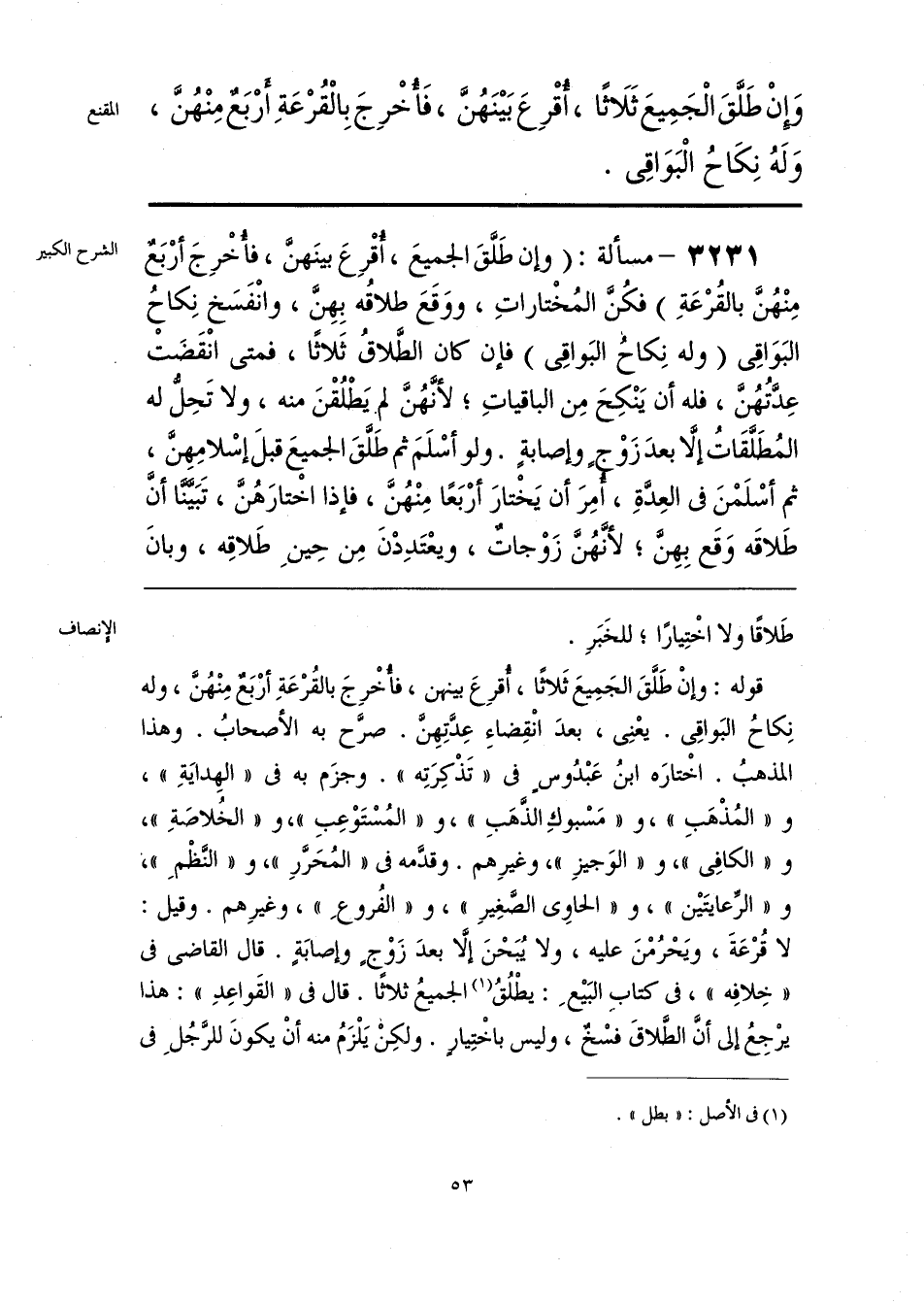 قوله: وإنْ طَلَّقَ الجَمِيعَ ثَلاثًا، أُقرِعَ بينهن، فأُخْرِجَ بالقُرْعَةِ أرْبَعٌ مِنْهُنَّ، وله نِكاحُ البَواقِي. يعْنِي، بعدَ انْقِضاءِ عِدَّتِهِنَّ. صرَّح به الأصحابُ. وهذا المذهبُ. اخْتارَه ابنُ عَبْدُوسٍ في «تَذْكِرَتِه». وجزَم به في «الهِدايَةِ»، و «المُذْهَبِ»، و «مَسْبوكِ الذَّهَبِ»، و «المُسْتَوْعِبِ»، و «الخُلاصَةِ»، و «الكافِي»، و «الوَجيزِ»، وغيرِهم. وقدَّمه في «المُحَرَّرِ»، و «النَّظْمِ»، و «الرِّعايتَين»، و «الحاوي الصَّغِيرِ»، و «الفُروعِ»، وغيرِهم. وقيل: لا قُرْعَةَ، ويَحْرُمْنَ عليه، ولا يُبَحْنَ إلَّا بعدَ زَوْجٍ وإصابَةٍ. قال القاضي في «خِلافِه»، في كتابِ البَيعِ: يطْلُقُ (¬1) الجميعُ ثلاثًا. قال في «القَواعِدِ»: هذا يرْجِعُ إلى أنَّ الطَّلاقَ فسْخٌ، وليس باخْتِيارٍ. ولكِنْ يَلْزَمُ منه أنْ يكونَ للرَّجُلِ في