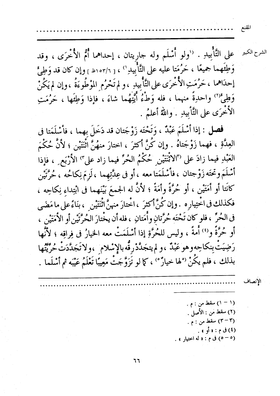 فصل: إذا أسْلَمَ عَبْدٌ، وَتَحْتَه زَوْجَتان قد دَخَلَ بِهما، فأسْلَمَتا في العِدَّةِ، فهما زَوْجَتاهُ. وإن كُنَّ أكثرَ، اختارَ منهُنَّ اثْنَتَين؛ لأنَّ حُكْمَ العَبْدِ فيما زادَ على [الاثْنَتَينِ حُكْمُ الحُرِّ فيما زاد على] (¬3) الأرْبَعِ، فإذا أسْلَمَ وتحتَه زَوْجتان، فأسْلَمَتا معه، أو في عِدَّتِهِما، لَزِمَ نِكاحُه، حُرَّتَين كانَتا أو أمَتَين، أو حُرَّةً وأمَةً؛ لأنَّ له الجمعَ بَينَهما في ابْتِداءِ نِكاحِه، فكذلك في اخْتِيارِه. وإن كُنَّ أكثرَ، اخْتارَ منهنَّ اثْنَتَينِ، بنَاءً على ما مَضَى في الحُرِّ، فلو كان تَحْتَه حُرَّتانِ وأَمَتانِ، فله أن يخْتارَ الحُرَّتَين أو الأمَتَين، أو حُرَّةً و (¬4) أَمةً، وليس للحُرَّةِ إذا أسْلَمَتْ معه الخيارُ في فِراقِه؛ لأنَّها رَضِيَتْ بِنكاحِه وهو عَبْدٌ، ولم يتجَدَّدْ رِقُّه بالإِسْلامِ، ولا تَجَدَّدَتْ حُرِّيَّتُها بذلك، فلم يكُنْ [لها خيارٌ] (¬5)، كما لو تَزَوَّجَتْ مَعِيبًا تَعْلَمُ عَيبَه ثم أسْلَما.
