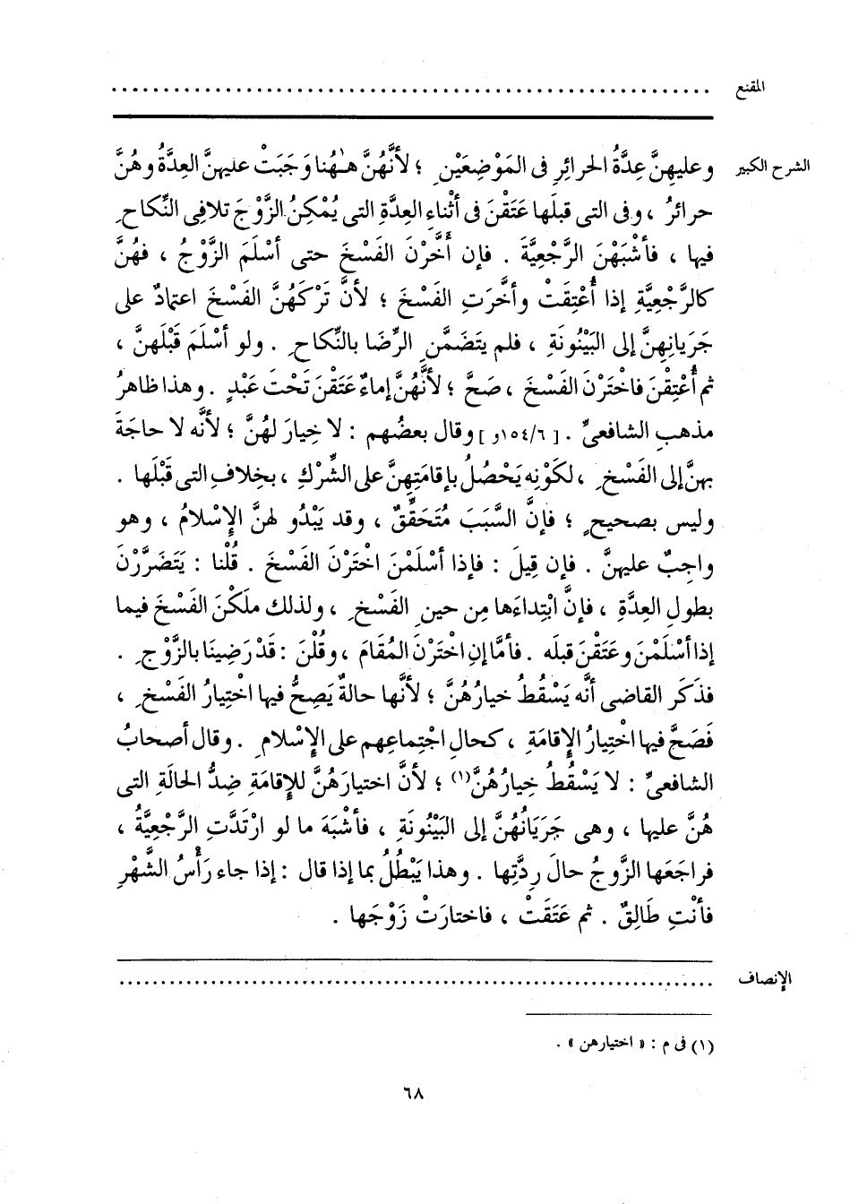 وعليهِنَّ عِدَّةُ الحرائِرِ في المَوْضِعَينِ؛ لأنَّهُنَّ ههُنا وَجَبَتْ عليهنَّ العِدَّةُ وهُنَّ حرائرُ، وفي التي قبلَها عَتَقْنَ في أثْناءِ العِدَّةِ التي يُمْكِنُ الزَّوْجَ تلافِي النِّكاحِ فيها، فأشْبَهْنَ الرَّجْعِيَّةَ. فإن أَخَّرْنَ الفَسْخَ حتى أسْلَمَ الزَّوْجُ، فهُنَّ كالرَّجْعِيَّةِ إذا أُعْتِقَتْ وأخَّرَتِ الفَسْخَ، لأنَّ تَرْكَهُنَّ الفَسْخَ اعتمادٌ على جَرَيانِهِنَّ إلى البَينُونَةِ، فلم يتَضَمَّنِ الرِّضَا بالنِّكاحِ. ولو أسْلَمَ قَبْلَهنَّ، ثم أُعْتِقْنَ فاخْتَرْنَ الفَسْخَ، صَحَّ، لأنَّهُنَّ إماءٌ عَتَقْنَ تحْتَ عَبْدٍ. وهذا ظاهرُ مذهبِ الشافعيِّ وقال بعضُهم: لا خِيارَ لهُنَّ؛ لأنَّه لا حاجَةَ بهنَّ إلى الفَسْخِ، لكَوْنِه يَحْصُلُ بإقامَتِهنَّ على الشِّرْكِ، بخِلافِ التي قَبْلَها. وليس بصحيحٍ، فإنَّ السَّبَبَ مُتَحَقِّقٌ، وقد يَبْدُو لهنَّ الإِسْلامُ، وهو واجِبٌ عليهنَّ. فإن قِيلَ: فإذا أسْلَمْنَ اخْتَرْنَ الفَسْخَ. قُلْنا: يَتَضَرَّرْنَ بطولِ العِدَّةِ، فإنَّ ابْتِداءَها مِن حينِ الفَسْخِ، ولذلك ملَكْنَ الفَسْخَ فيما إذا أسْلَمْنَ وعَتَقْنَ قبلَه. فأمَّا إنِ اخْتَرْنَ المُقَامَ، وقُلْنَ: قَدْ رَضِينَا بالزَّوْجِ. فذَكَر القاضي أنَّه يَسْقُطُ خيارُهُنَّ؛ لأنَّها حالةٌ يَصِحُّ فيها اخْتِيارُ الفَسْخِ، فَصَحَّ فيها اخْتِيارُ الإِقامَةِ، كحالِ اجْتِماعِهم على الإِسْلامِ. وقال أصحابُ الشافعيِّ: لا يَسْقُطُ خِيارُهُنَّ (¬1)، لأنَّ اختيارَهُنَّ للإقامَةِ ضِدُّ الحالةِ التي هُنَّ عليها، وهي جَرَيَانُهُنَّ إلى البَينُونَةِ، فأشْبَهَ ما لو ارْتَدَّتِ الرَّجْعِيَّةُ، فراجَعَها الزَّوجُ حال رِدَّتِها. وهذا يَبْطُلُ بما إذا قال: إذا جاء رَأْسُ الشَّهْرِ فأنْتِ طَالِقٌ. ثم عَتَقَتْ، فاختارَتْ زَوْجَها.