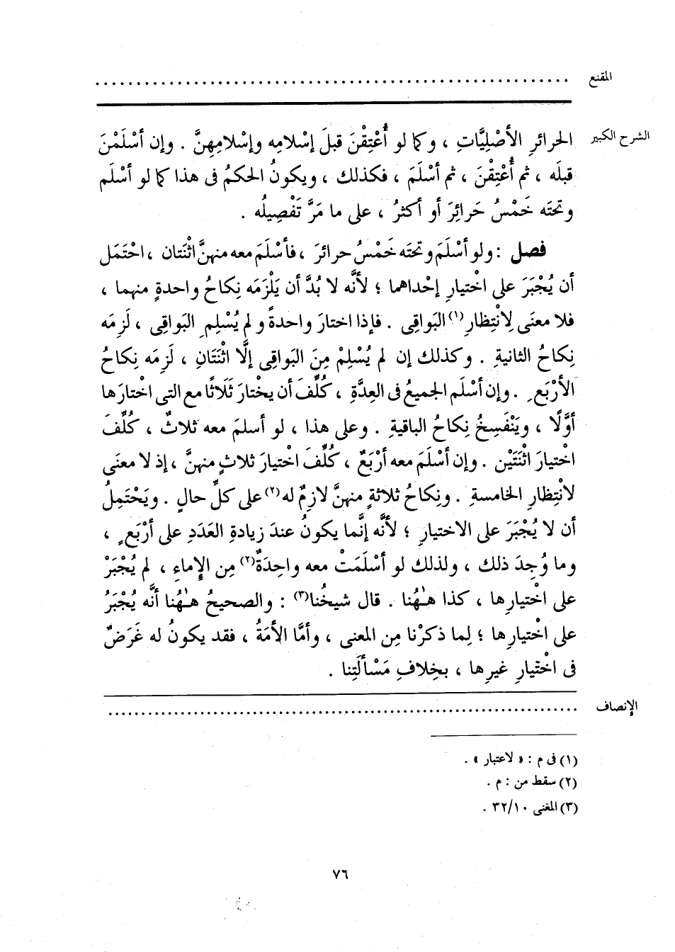 فصل: ولو أسْلَمَ وتحتَه خَمْسُ حرائرَ، فأسْلَمَ معه منهنَّ اثْنَتان، احْتَمَل أن يُجْبَرَ على اخْتيارِ إحْداهما؛ لأنَّه لا بُدَّ أن يَلْزَمَه نِكاحُ واحدةٍ منهما، فلا معنَى لِانْتِظارِ (¬1) البَواقِي. فإذا اختارَ واحدةً ولم يُسْلِمِ البَواقِي، لَزِمَه نِكاحُ الثانيةِ. وكذلك إن لم يُسْلِمْ مِنَ البَواقِي إلَّا اثْنَتَانِ، لَزِمَه نِكاحُ الأرْبَعِ. وإن أسْلَم الجميعُ في العِدَّةِ، كُلِّفَ أن يخْتارَ ثَلَاثًا مع التي اخْتارَها أوَّلًا، ويَنْفسِخُ نِكاحُ الباقيةِ. وعلى هذا، لو أسلمَ معه ثلاثٌ، كُلِّفَ اخْتيارَ اثْنَتَين. وإن أسْلَمَ معه أرْبَعٌ، كُلِّفَ اخْتيارَ ثلاثٍ منهنَّ، إذ لا معنَى لانْتِظارِ الخامسةِ. ونِكاحُ ثلاثةٍ منهنَّ لازِمٌ له (2) على كلِّ حالٍ. ويَحْتَمِلُ أن لا يُجْبَرَ على الاختيارِ؛ لأنَّه إنَّما يكونُ عندَ زيادةِ العَدَدِ على أرْبَعٍ، وما وُجِدَ ذلك، ولذلك لو أسْلَمَتْ معه واحِدَةٌ (¬2) مِن الإماءِ، لم يُجْبَرْ على اخْتيارِها، كذا ههُنا. قال شيخُنا (¬3): والصحيحُ ههُنا أنَّه يُجْبَرُ على اختيارِها؛ لِما ذكرْنا مِن المعنى، وأمَّا الأمَةُ، فقد يكونُ له غَرَضٌ في اخْتيارِ غيرِها، بخِلافِ مَسْألَتِنا.
