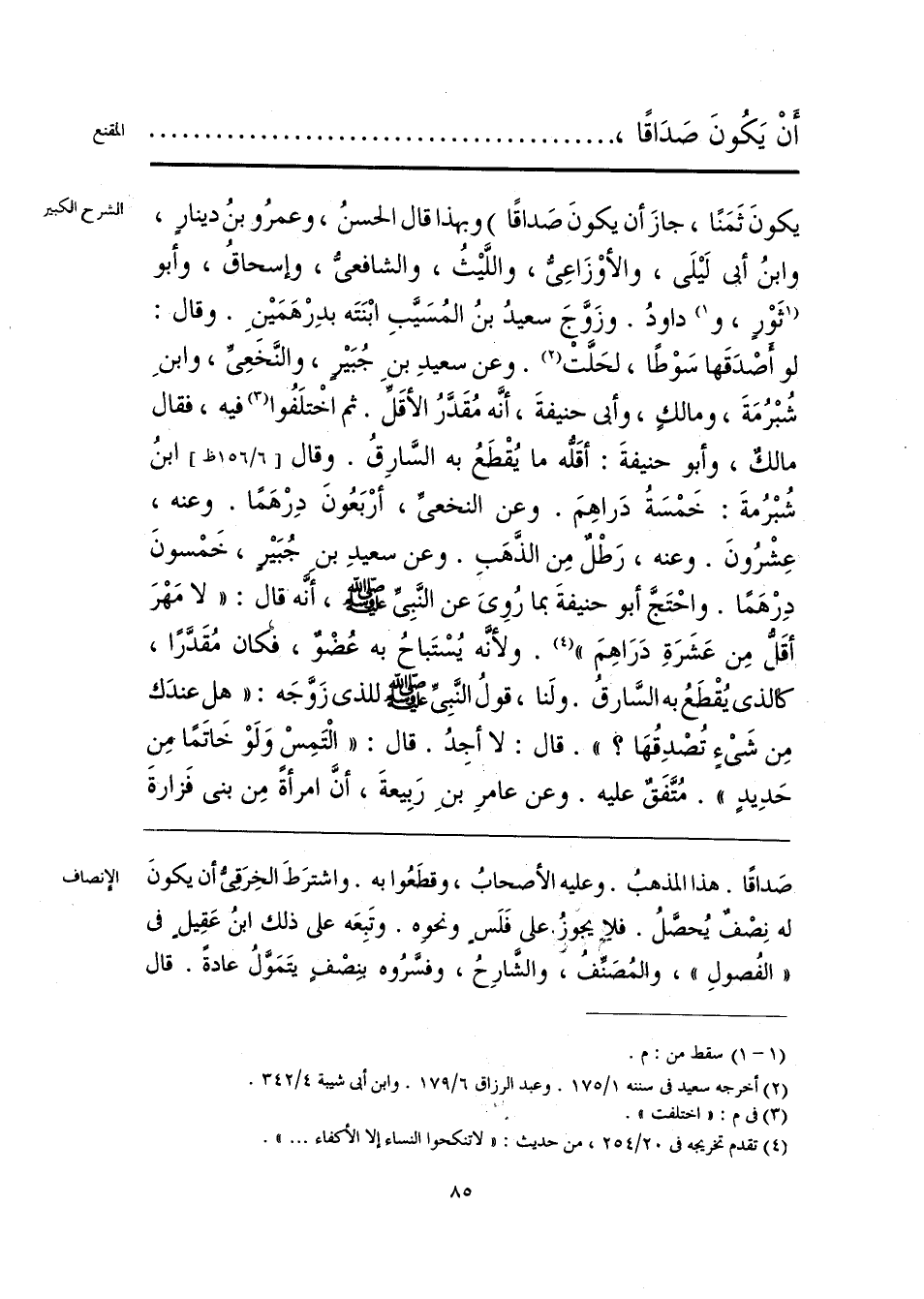 صَداقًا. هذا المذهبُ. وعليه الأصحابُ، وقطَعُوا به. واشترَطَ الخِرَقيُّ أن يكونَ له نِصْفٌ يُحصَّلُ. فلا يجوَزُ، على فَلَسٍ ونحوه. وتَبِعَه على ذلك ابنُ عَقِيلٍ في «الفُصولِ»، والمُصَنِّفُ، والشَّارِحُ، وفسَّرُوه بنِصْفٍ يتَمَوَّلُ عادةً. قال
