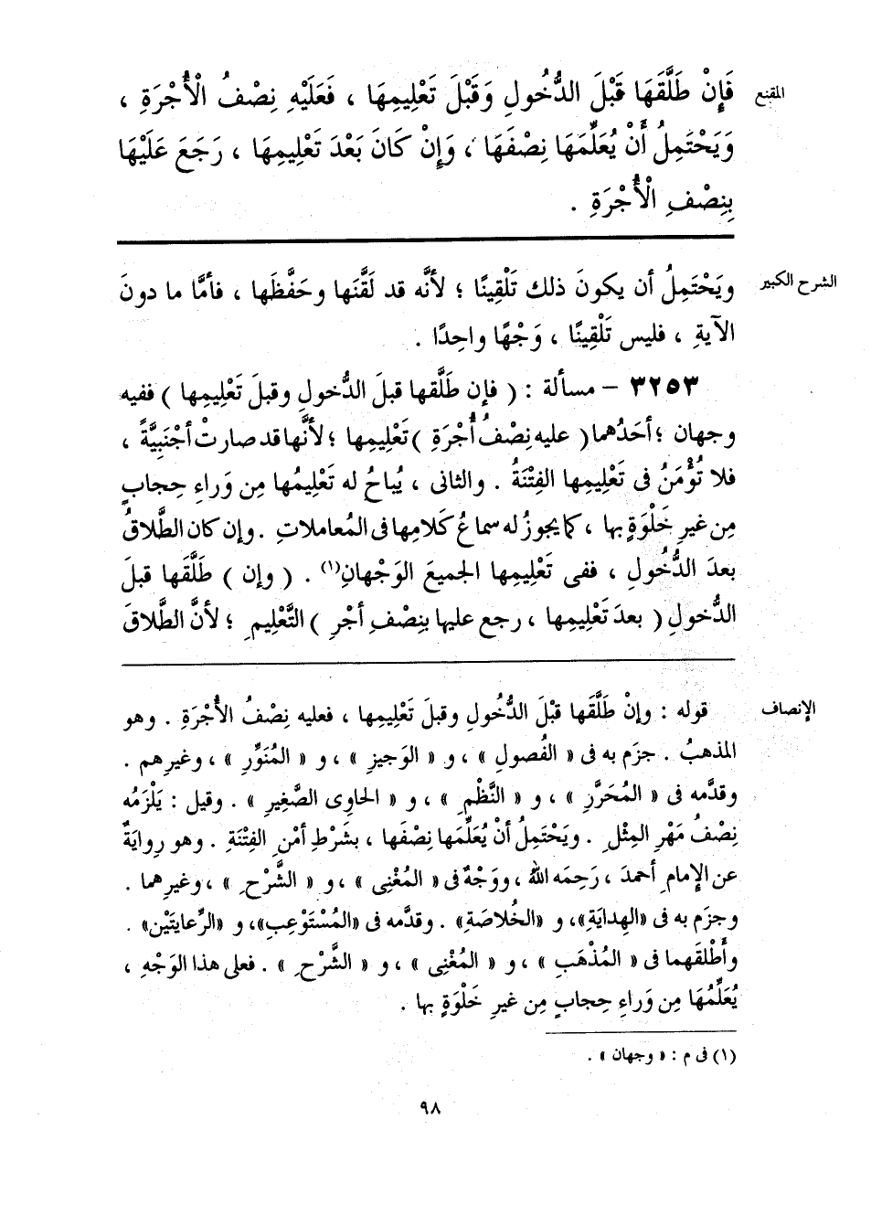 قوله: وإنْ طَلَّقَها قبْلَ الدُّخُولِ وقبلَ تَعْلِيمِها، فعليه نِصْفُ الأُجْرَةِ. وهو المذهبُ. جزَم به في «الفُصولِ»، و «الوَجيزِ»، و «المُنَوِّرِ»، وغيرِهم. وقدَّمه في «المُحَرَّرِ»، و «النَّظْمِ»، و «الحاوي الصَّغِيرِ». وقيل: يَلْزَمُه نِصْفُ مَهْرِ المِثْلِ. ويَحْتَمِلُ أنْ يُعَلِّمَها نِصْفَها، بشَرْطِ أمْنِ الفِتْنَةِ. وهو رِوايَةٌ عن الإِمامِ أحمدَ، رَحِمَه اللهَ، ووَجْهٌ في «المُغْنِي»، و «الشَّرْحِ»، وغيرِهما. وجزَم به في «الهِدايَةِ»، و «الخُلاصَةِ». وقدَّمه في «المُسْتَوْعِبِ»، و «الرِّعايتَين». وأطْلقَهما في «المُذْهَبِ»، و «المُغْنِي»، و «الشّرْحِ». فعلى هذا الوَجْهِ، يُعَلِّمُهَا مِن وَراءِ حِجابٍ مِن غيرِ خَلْوَةٍ بها.