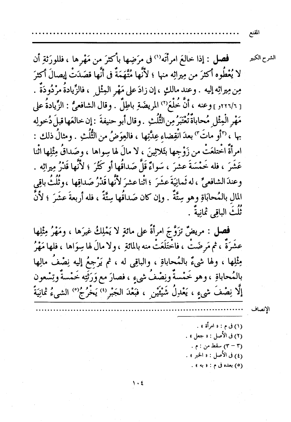 فصل: مريضٌ تزَوَّجَ امرأةً على مائةٍ لا يَمْلِكُ غيرَها، ومَهْرُ مِثْلِها عشَرَةٌ، ثم مَرِضَتْ، فاخْتَلَعَتْ منه بالمائةِ، ولا مالَ لها سِوَاها، فلها مَهْرُ مِثْلِها، ولها شئٌ بالمُحاباةِ، والباقِى له، ثم يَرْجِعُ إليه نِصْفُ مالِها بالمُحاباةِ، وهو خَمْسةٌ ونِصْفُ شئ، فصارَ مع وَرَثَتِه خَمْسةٌ وتِسْعون إلَّا نِصْفَ شئٍ، يَعْدِلُ شَيْئَيْنِ، فبَعْدَ الجَبْرِ (¬4) يَخْرُجُ (¬5) الشئُ ثمانِيَةً
