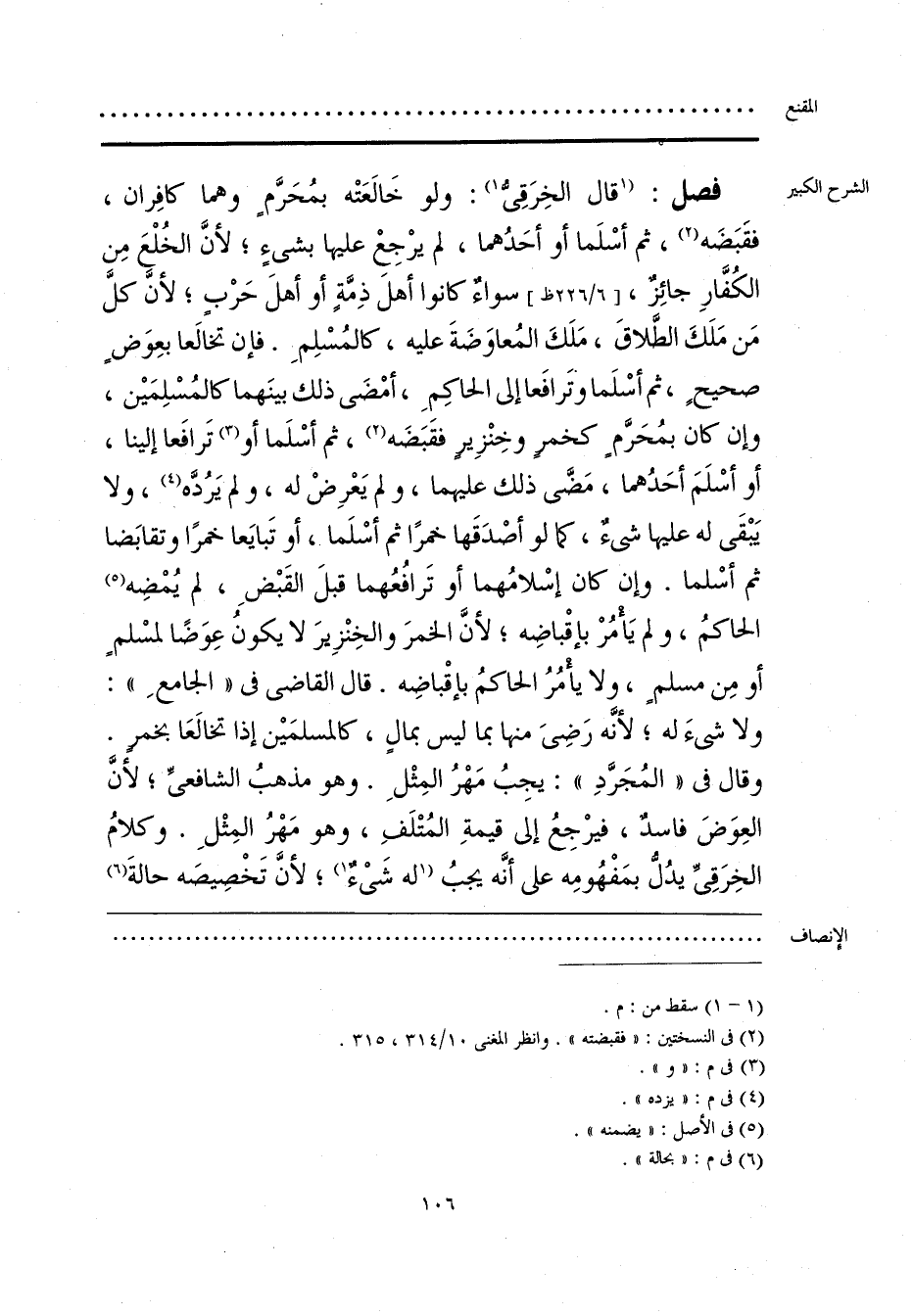 فصل: [قال الخِرَقِىُّ] (¬1): ولو خَالَعَتْه بمُحَرَّمٍ وهما كافِران، فقَبَضَه (2)، ثم أسْلَما أو أحَدُهما، لم يرْجِعْ عليها بشئٍ؛ لأَنَّ الخُلْعَ مِن الكُفَّارِ جائِزٌ، سواءٌ كانوا أهلَ ذِمَّةٍ أو أهلَ حَرْبٍ؛ لأَنَّ كلَّ مَن مَلَكَ الطَّلاقَ، مَلَكَ المُعاوَضَةَ عليه، كالمُسْلِمِ. فإن تخالَعا بعِوَضٍ صحيحٍ، ثم أسْلَما وتَرافَعا إلى الحاكِمِ، أمْضَى ذلك بينَهما كالمُسْلِمَيْن، وإن كان بمُحَرَّمٍ كخمرٍ وخِنْزِيرٍ فقَبَضَه (¬2)، ثم أسْلَما أو (¬3) تَرافَعا إلينا، أو أسْلَمَ أحَدُهما، مَضَّى ذلك عليهما، ولم يَعْرِضْ له، ولم يَرُدَّه (¬4)، ولا يَبْقَى له عليها شئٌ، كما لو أصْدَقَها خمرًا ثم أسْلَما، أو تَبايَعا خمرًا وتقابَضا ثم أسْلما. وإن كان إسْلامُهما أو تَرافُعُهما قبلَ القَبْضِ، لم يُمْضِه (¬5) الحاكمُ، ولم يَأْمُرْ بإقْباضِه؛ لأَنَّ الخمرَ والخِنْزِيرَ لا يكونُ عِوَضًا لمسْلمٍ أو مِن مسلمٍ، ولا يأْمُرُ الحاكمُ بإقْباضِه. قال القاضى في «الجامعِ»: ولا شئَ له؛ لأنَّه رَضِىَ منها بما ليس بمالٍ، كالمسلمَيْن إذا تخالَعَا بخمرٍ. وقال في «المُجَرَّدِ»: يجِبُ مَهْرُ المِثْلِ. وهو مذهبُ الشافعىِّ؛ لأَنَّ العِوَضَ فاسدٌ، فيرْجِعُ إلى قيمةِ المُتْلَفِ، وهو مَهْرُ المِثْلِ. وكلامُ الخِرَقِىِّ يدُلُّ بمَفْهُومِه على أنَّه يجبُ [له شَىْءٌ] (1)؛ لأَنَّ تَخْصِيصَه حالةَ (¬6)