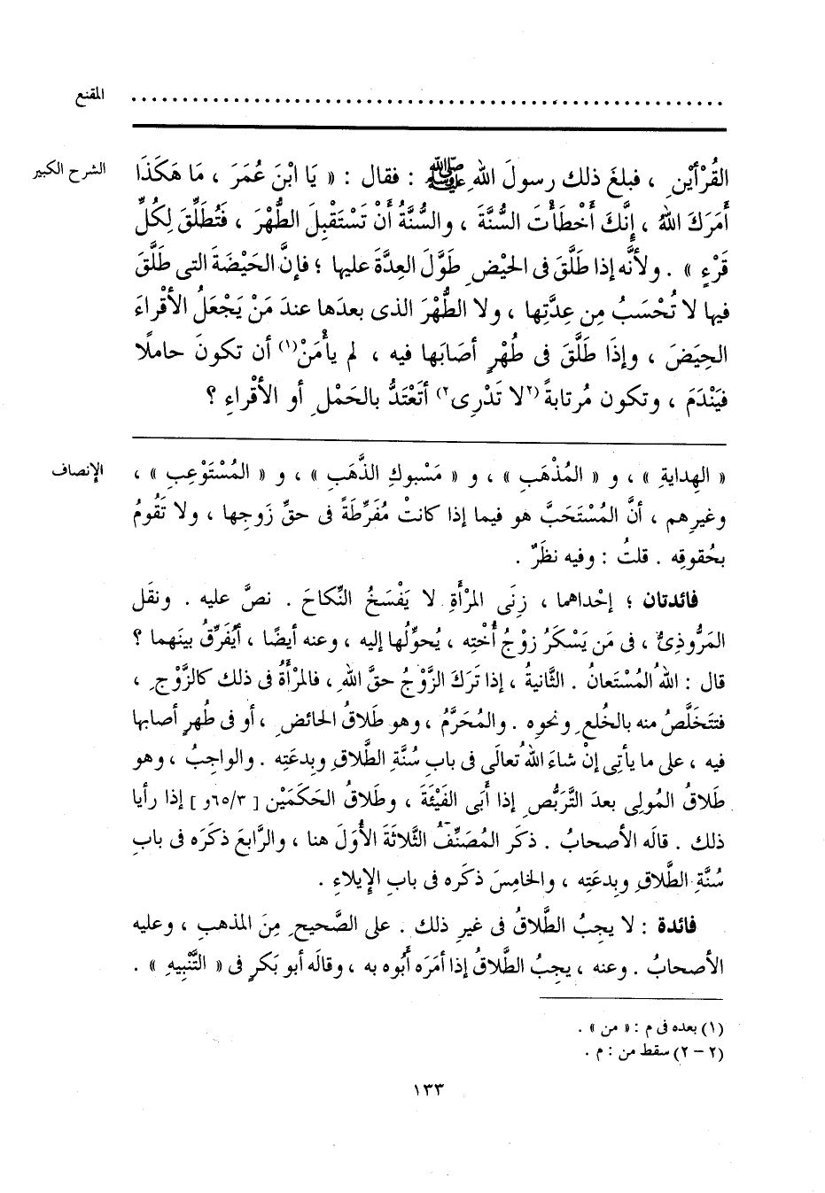 فائدتان؛ إحْداهما، زِنَى المرْأةِ لا يَفْسَخُ النِّكاحَ. نصَّ عليه. ونقَل المَرُّوذِىُّ، فى مَن يَسْكَرُ زوْجُ أُخْتِه، يُحوِّلُها إليه، وعنه أيضًا، أيُفَرِّقُ بينَهما؟ قال: اللَّهُ المُسْتَعانُ. الثَّانيةُ، إذا تَرَكَ الزَّوْجُ حقَّ اللَّهِ، فالمرْأَةُ فى ذلك كالزَّوْجِ، فتتَخَلَّصُ منه بالخُلعِ ونحوِه. والمُحَرَّمُ، وهو طَلاقُ الحائضِ، أو فى طُهرٍ أصابها فيه، على ما يأتِى إنْ شاءَ اللَّهُ تعالَى فى بابِ سُنَّةِ الطَّلاقِ وبِدعَتِه. والواجِبُ، وهو طَلاقُ المُولِى بعدَ التَّرَبُّصِ إذا أَبَى الفَيْئَةَ، وطَلاقُ الحَكَمَيْن إذا رأيا ذلك. قالَه الأصحابُ. ذكَر المُصَنِّف الثَّلاثَةَ الأوَلَ هنا، والرَّابعَ ذكَرَه فى بابِ سُنَّةِ الطَّلاقِ وبِدعَتِه، والخامِسَ ذكَره فى بابِ الإِيلاءِ.