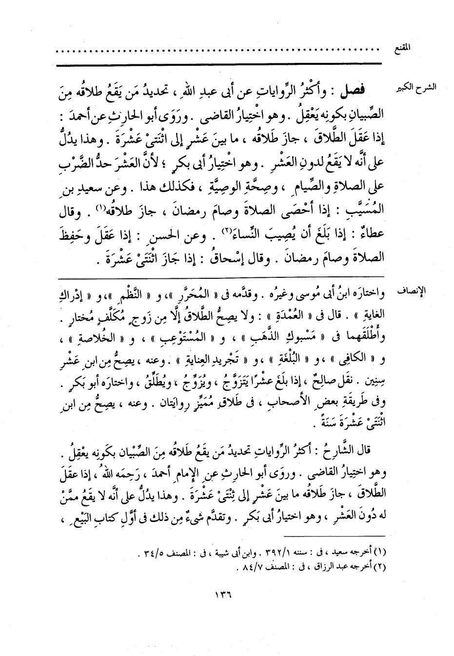 واختارَه ابنُ أبى مُوسى وغيرُه. وقدَّمه فى «المُحَرَّرِ»، و «النَّظْمِ»، و «إِدْراكِ الغايةِ». قال فى «العُمْدَةِ»: ولا يصِح الطَّلاقُ إلَّا مِن زَوجٍ مُكَلَّفٍ مُختارٍ. وأَطْلَقَهما فى «مَسْبوكِ الذَّهَبِ»، و «المُسْتَوْعِبِ»، و «الخُلاصةِ»، و «الكافِى»، و «البُلْغَةِ»، و «تَجْريدِ العِنايةِ». وعنه، يصِحُّ مِن ابنِ عَشْرِ سِنِين. نقَل صالِحٌ، إذا بلَغَ عشْرًا يَتَزَوَّجُ، ويُزَوِّجُ، ويُطَلقُ، واختارَه أبو بَكرٍ. وفى طَريقَةِ بعضِ الأصحابِ، فى طَلاقِ مُمَيِّزٍ رِوايَتان. وعنه، يصِحُّ مِن ابنِ اثْنَتَىْ عَشْرَةَ سَنَةً.
