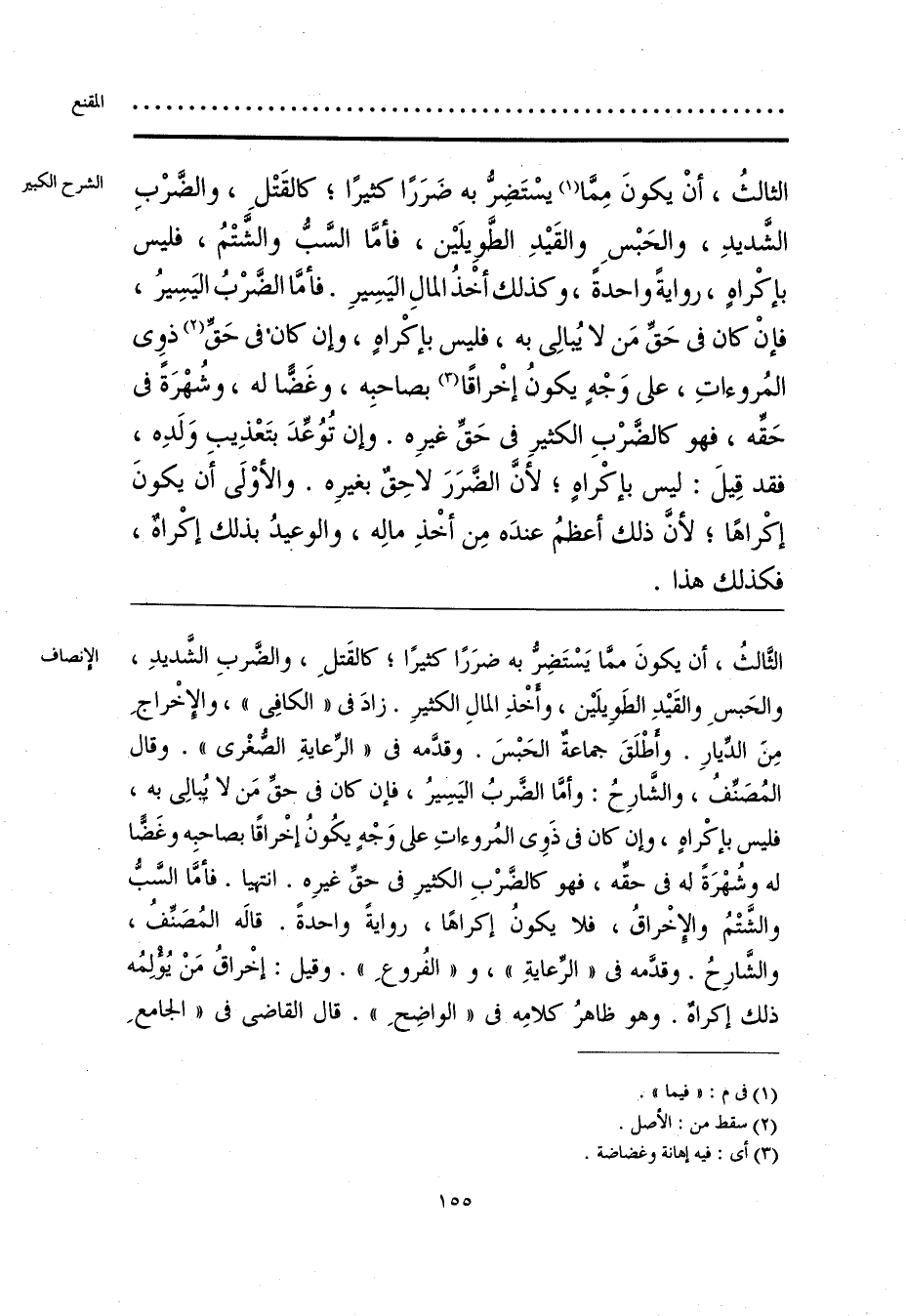 الثَّالثُ، أن يكونَ ممَّا يَسْتَضِرُّ به ضرَرًا كثيرًا؛ كالقَتلِ، والضَّربِ الشَّديدِ، والحَبسِ والقَيْدِ الطَوِيلَيْن، وأَخْذِ المالِ الكثيرِ. زادَ فى «الكافِى»، والإِخْراجِ مِنَ الدِّيارِ. وأَطْلَقَ جماعةٌ الحَبْسَ. وقدَّمه فى «الرِّعايَةِ الصُّغْرى». وقال المُصَنِّفُ، والشَّارِحُ: وأمَّا الضَّربُ اليَسِيرُ، فإن كان فى حقِّ مَن لا يُبالِى به، فليس بإكْراهٍ، وإن كان فى ذَوِى المُروءاتِ على وَجْهٍ يكُونُ إخْراقًا بصاحبِه وغَضًّا له وشُهْرَةً له فى حقِّه، فهو كالضَّرْبِ الكثيرِ فى حقِّ غيرِه. انتهيا. فأمَّا السَّبُّ والشَّتْمُ والإِخْراقُ، فلا يكونُ إكراهًا، روايةً واحدةً. قالَه المُصَنِّفُ، والشَّارِحُ. وقدَّمه فى «الرِّعايَةِ»، و «الفُروعِ». وقيل: إخْراقُ مَنْ يُؤْلِمُه ذلك إكراهٌ. وهو ظاهرُ كلامِه فى «الواضِحِ». قال القاضى فى «الجامعِ