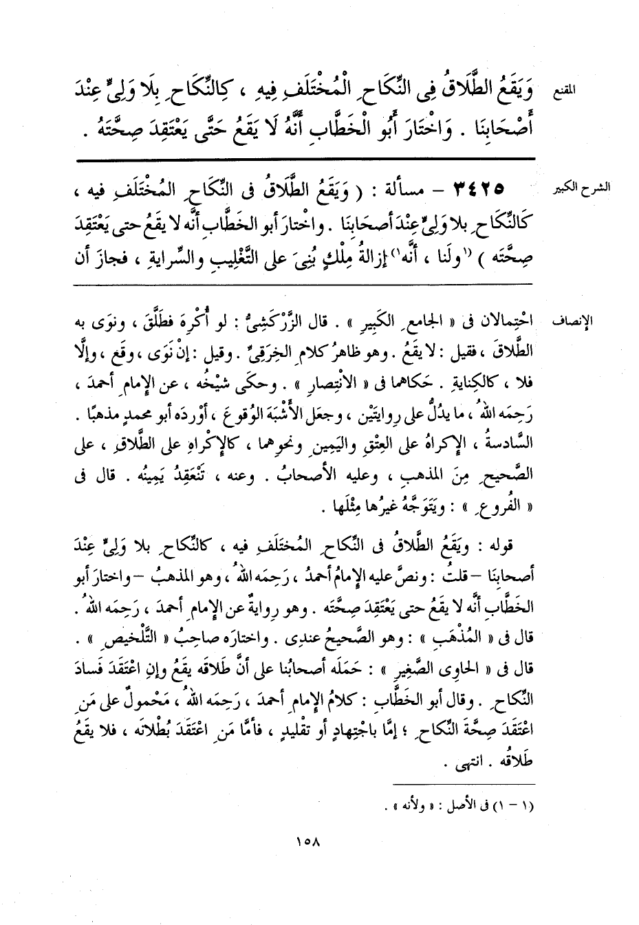 قوله: ويَقَعُ الطَّلاقُ فى النِّكاحِ المُختَلَفِ فيه، كالنِّكاحِ بلا وَلِىٍّ عِنْدَ أصحابِنَا -قلتُ: ونصَّ عليه الإِمامُ أحمدُ، رَحِمَه اللَّهُ، وهو المذهبُ- واختارَ أبو الخَطَّابِ أنَّه لا يقَعُ حتى يَعْتَقِدَ صِحَّتَه. وهو رِوايةٌ عن الإِمامِ أحمدَ، رَحِمَه اللَّهُ. قال فى «المُذْهَبِ»: وهو الصَّحيحُ عندِى. واختارَه صاحِبُ «التَّلْخيصِ». قال فى «الحاوِى الصَّغِيرِ»: حَمَلَه أصحابُنا على أنَّ طَلاقَه يقَعُ وإنِ اعْتَقَدَ فَسادَ النِّكاحِ. وقال أبو الخَطَّابِ: كلامُ الإِمامِ أحمدَ، رَحِمَه اللَّهُ، مَحْمولٌ على مَنِ اعْتَقَدَ صِحَّةَ النِّكاحِ؛ إمَّا باجْتِهادٍ أو تقْليدٍ، فأمَّا مَنِ اعْتَقَدَ بُطْلانَه، فلا يقَعُ طَلاقُه. انتهى.