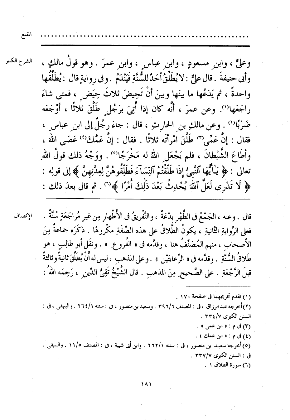 قال. وعنه، الجَمْعُ فى الطُّهْرِ بدْعَةٌ، والتَّفْريقُ فى الأَطْهارِ مِن غيرِ مُراجَعَةٍ سُنَّةٌ. فعلى الرِّوايةِ الثَّانيةِ، يكونُ الطَّلاقُ على هذه الصِّفَةِ مكْروهًا. ذكَرَه جماعةٌ مِنَ الأصحابِ، منهم المُصَنِّفُ هنا، وقدَّمه فى «الفُروعِ». ونقَل أبو طالِبٍ، هو طَلاقُ السُّنَّةِ. وقدَّمه فى «الرِّعايتَيْن». وعلى المذهبِ، ليس له أَنْ يُطَلِّقَ ثانيةً وثالثةً قبلَ الرَّجْعَةِ. على الصَّحيحِ مِنَ المذهبِ. قال الشَّيْخُ تَقِىُّ الدِّينِ، رَحِمَه اللَّهُ: