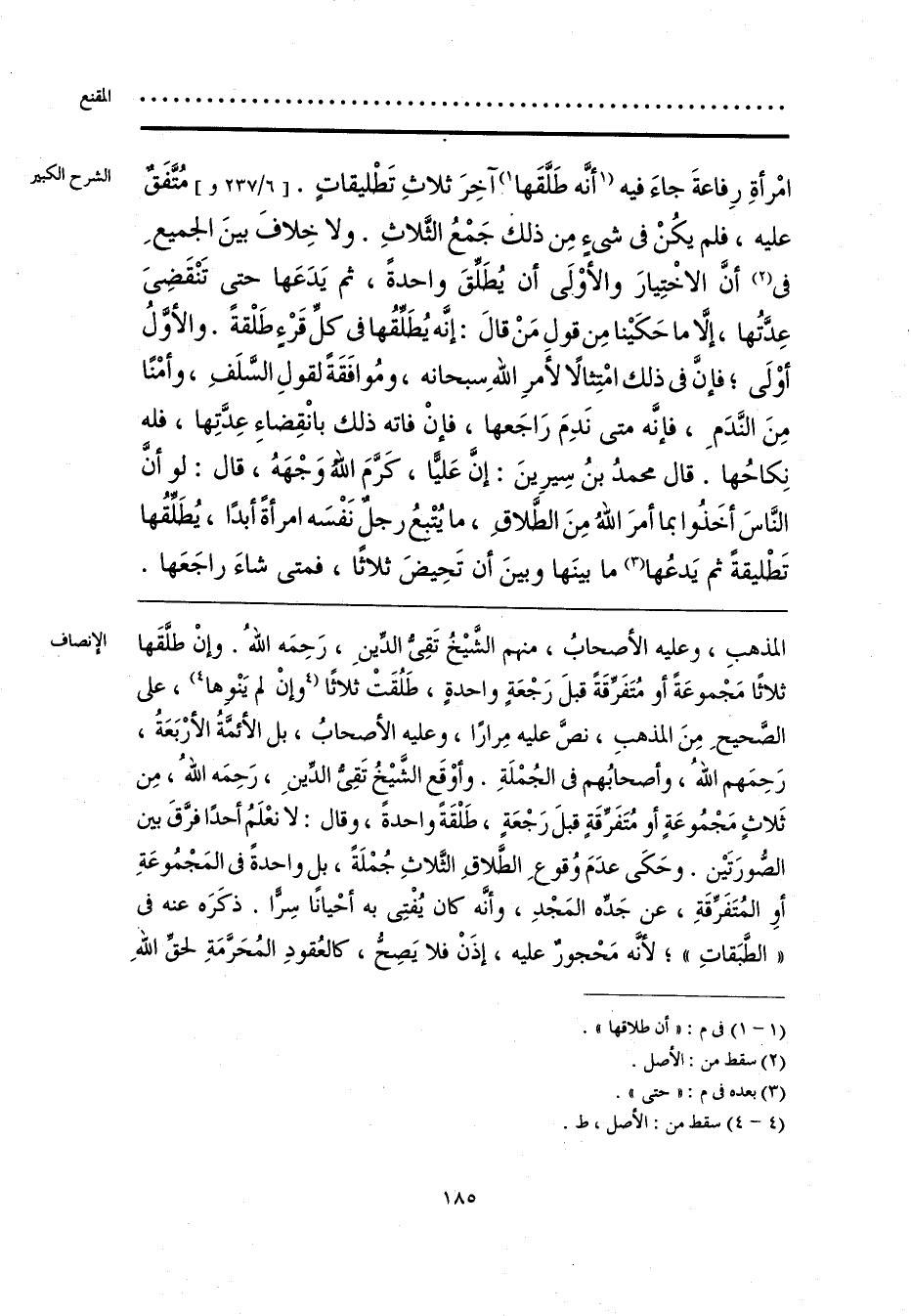 المذهبِ، وعليه الأصحابُ، منهم الشَّيْخُ تَقِىُّ الدِّينِ، رَحِمَه اللَّهُ. وإنْ طلَّقَها ثلاثًا مَجْموعَةً أو مُتَفَرِّقَةً قبلَ رَجْعَةٍ واحدةٍ، طَلُقَتْ ثلاثًا [وإنْ لم يَنْوِها] (¬1)، على الصَّحيحِ مِنَ المذهبِ، نصَّ عليه مِرارًا، وعليه الأصحابُ، بل الأئمَّةُ الأرْبَعَةُ، رَحِمَهم اللَّهُ، وأصحابُهم فى الجُمْلَةِ. وأوْقَع الشَّيْخُ تَقِىُّ الدِّينِ، رَحِمَه اللَّهُ، مِن ثَلاثٍ مَجْمُوعَةٍ أو مُتَفَرِّقَةٍ قبلَ رَجْعَةٍ، طَلْقَةً واحدةً، وقال: لا نعْلَمُ أحدًا فرَّقَ بين الصُّورَتَيْن. وحَكَى عدَمَ وُقوعِ الطَّلاقِ الثَّلاثِ جُمْلَةً، بل واحدةً فى المَجْمُوعَةِ أوِ المُتَفَرِّقَةِ، عنِ جَدِّه المَجْدِ، وأنَّه كان يُفْتِى به أحْيانًا سِرًّا. ذكَرَه عنه فى «الطَّبَقاتِ»؛ لأنَّه مَحْجورٌ عليه، إذَنْ فلا يَصِحُّ، كالعُقودِ المُحَرَّمَةِ لحقِّ اللَّهِ