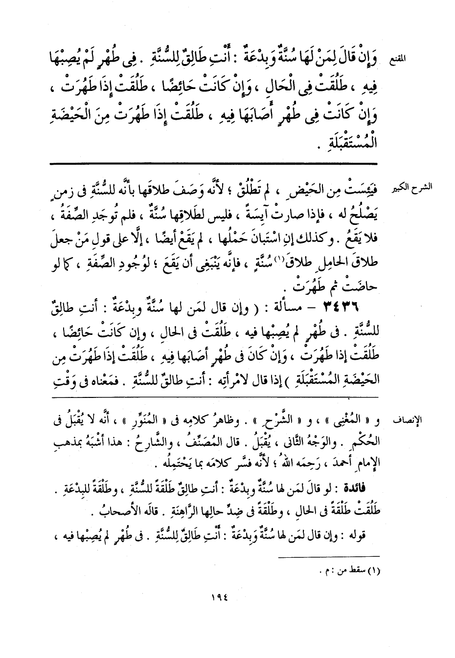 فائدة: لو قالَ لمَن لها سُنَّةٌ وبِدْعَةٌ: أنتِ طالِقٌ طَلْقَةً للسُّنَّةِ، وطَلْقَةً للبِدْعَةِ. طَلُقَتْ طَلْقَةً فى الحالِ، وطَلْقَةً فى ضِدِّ حالِها الرَّاهِنَةِ. قالَه الأصحابُ.