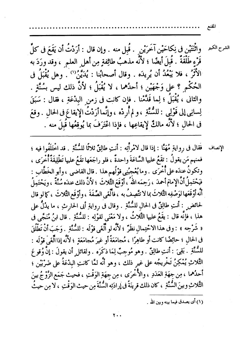 فَقال فى رِوايةِ مُهَنَّا: إذا قال لامْرأَتِه: أنتِ طالِقٌ ثلاثًا للسُّنَّةِ. قد اخْتَلَفُوا فيه؛ فمنهم مَن يقولُ: تقَعُ عليها السَّاعَةَ واحدةٌ، فلو راجَعَها تقَعُ عليها تَطْلِيقَةٌ أُخْرَى، وتكونُ عندَه على أُخْرَى. وما يُعْجِبُنِى قوْلُهم هذا. قال القاضى، وأبو الخَطَّابِ: فيَحْتَمِلُ أنَّ الإِمامَ أحمدَ، رَحِمَه اللَّهُ، أوْقَعَ الثَّلاثَ؛ لأَنَّ ذلك عندَه سُنَّةٌ، ويَحْتَمِلُ أنَّه أوْقَعَها لوَصْفِه الثَّلاثَ بما لا تتَّصِفُ به، فأَلْغِى الصِّفَةَ، وأوْقَع الثَّلاثَ، كما لو قال لحائضٍ: أنتِ طالِقٌ فى الحالِ للسُّنَّةِ. وقال فى رِوايةِ أبى الحارِثِ، ما يدُلُّ على هذا، فإنَّه قال: يقَعُ عليها الثَّلاثُ، ولا مَعْنَى لقوْلِه: للسُّنَّةِ. قال ابنُ مُنَجَّى فى «شَرْحِه»: وفى هذا الاحْتِمالِ نظَرٌ؛ لأنَّه لو أَلْغَى قوْلَه: للسُّنَّةِ. وَجَبَ أَنْ تَطْلُقَ فى الحالِ؛ حائِضًا كانت أو طاهِرًا، مُجامَعَةً أو غيرَ مُجامَعَةٍ؛ لأنَّه إذا أَلْغَى قوْلَه: للسُّنَّةِ. بَقِىَ: أنتِ طالِقٌ. وهو مُوجِبٌ لِمَا ذكَرَه. ولقائلٍ أن يقولَ: إنَّ وُقوعَ الثَّلاثِ يُمْكِنُ تَخْريجُه على غيرِ ذلك، وهو أنَّه لمَّا كانتِ البِدْعَةُ على ضَرْبَيْن؛ أحدُهما، مِن جهَةِ العَدَدِ، والأُخْرَى، مِن جِهَةِ الوَقْتِ، فحيث جَمَع الزَّوْجُ بينَ الثَّلاثِ وبينَ السُّنَّةِ، كان ذلك قرِينَةً فى إرادَتِه السُّنَّةَ مِن حيث الوَقْتِ، لا مِن حيثُ