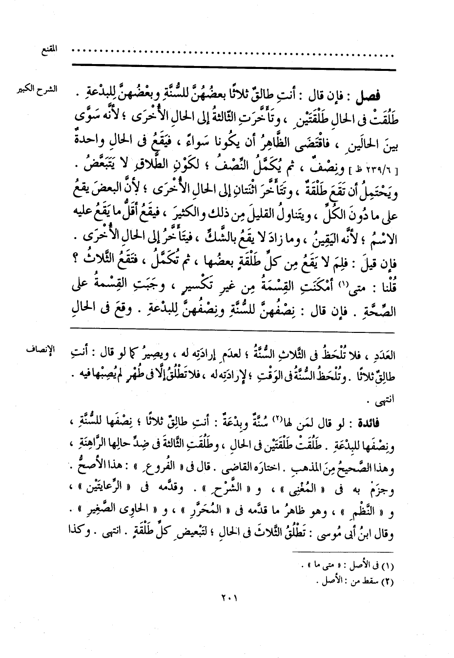 العَدَدِ، فلا تُلْحَظُ فى الثَّلاثِ السُّنَّةُ؛ لعدَمِ إرادَتِه له، ويصِيرُ كما لو قال: أنتِ طالِقٌ ثلاثًا. وتُلْحَظُ السُّنَّةُ فى الوَقْتِ؛ لإرادَتِه له، فلا تَطْلُقُ إلَّا فى طُهْرٍ لم يُصِبْها فيه. انتهى.