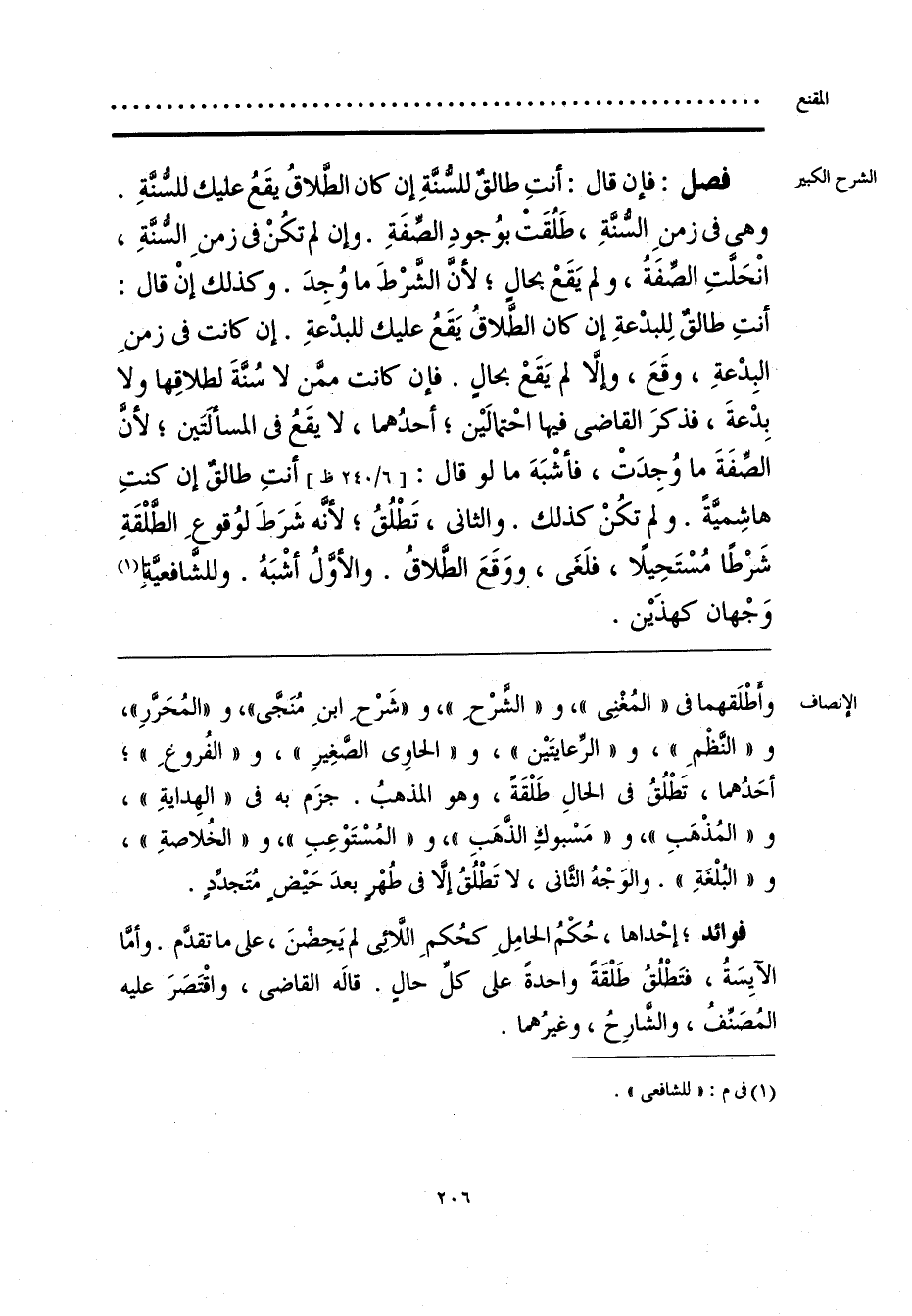 وأَطْلَقهما فى «المُغْنِى»، و «الشَّرْحِ»، و «شَرْحِ ابنِ مُنَجَّى»، و «المُحَرَّرِ»، و «النَّظْمِ»، و «الرِّعايتَيْن»، و «الحاوِى الصَّغِيرِ»، و «الفُروعِ»؛ أحَدُهما، تَطْلُقُ فى الحالِ طَلْقَةً، وهو المذهبُ. جزَم به فى «الهِدايَةِ»، و «المُذْهَبِ»، و «مَسْبوك الذَّهَبِ»، و «المُسْتَوْعِبِ»، و «الخُلاصةِ»، و «البُلْغَةِ». والوَجْهُ الثَّانى، لا تَطْلُقُ إلَّا فى طُهْرٍ بعدَ حَيْض مُتَجدِّدٍ.