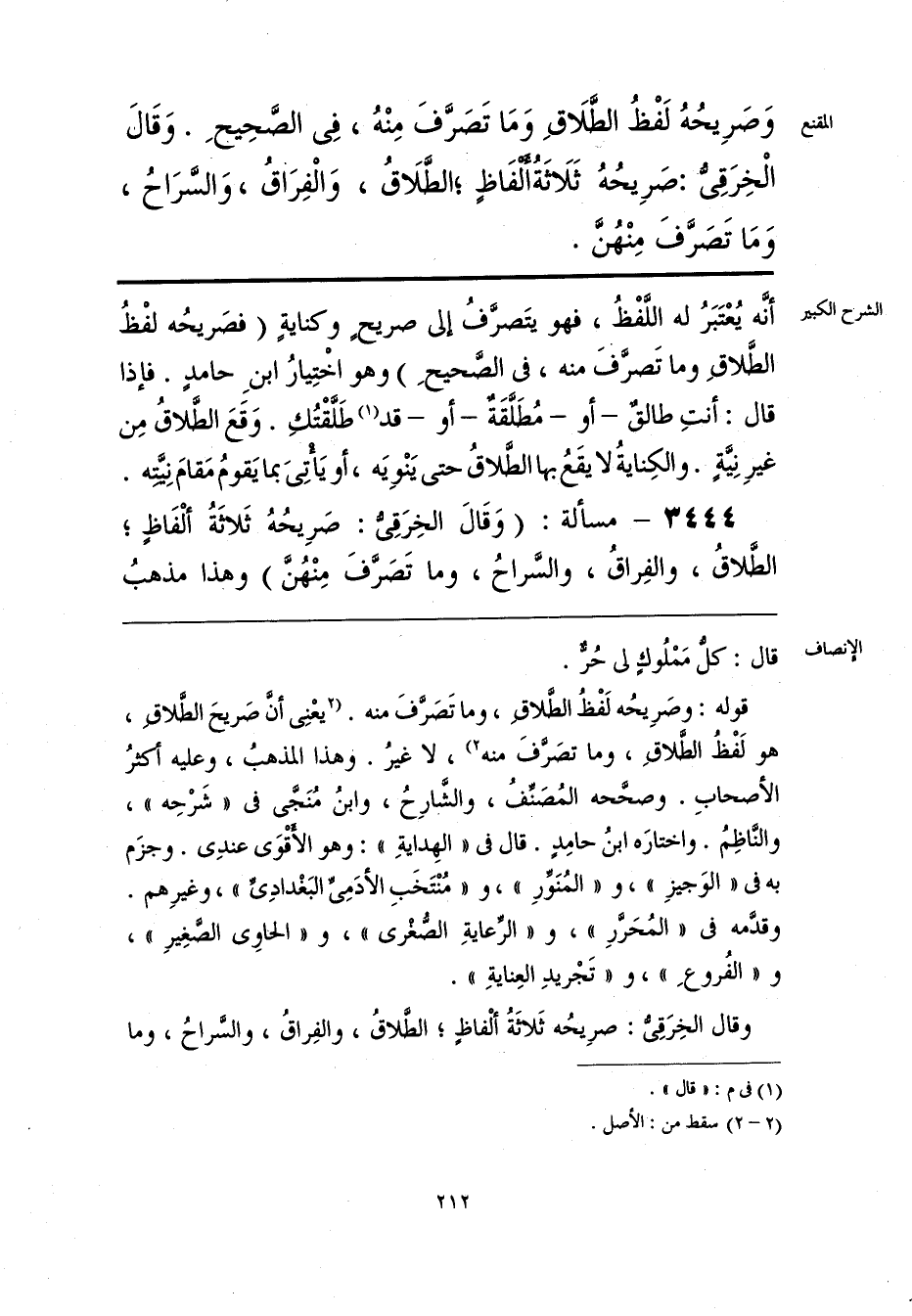 وقال الخِرَقىُّ: صرِيحُه ثَلَاثَةُ ألْفاظٍ؛ الطَّلاقُ، والفِراقُ، والسَّراحُ، وما
