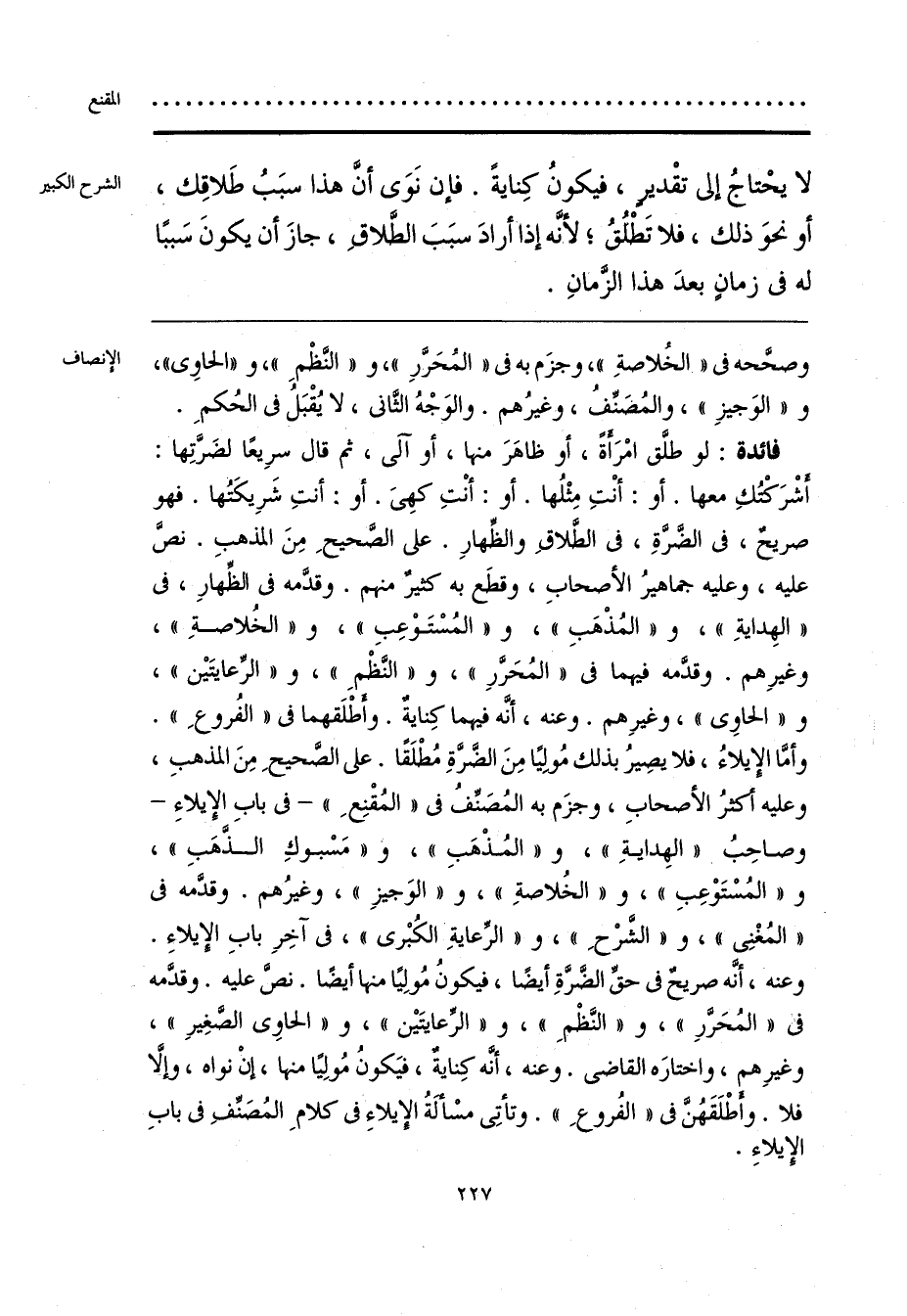 فائدة: لو طلَّق امْرَأَةً، أو ظاهَرَ منها، أو آلَى، ثم قال سرِيعًا لضَرَّتِها: اشْرَكْتُكِ معها. أو: أنْتِ مِثْلُها. أو: أنْتِ كهِىَ. أو: أنتِ شَرِيكَتُها. فهو صريحٌ، فى الضَّرَّةِ، فى الطَّلاقِ والظِّهارِ. على الصَّحيحِ مِنَ المذهبِ. نصَّ عليه، وعليه جماهيرُ الأصحابِ، وقطَع به كثيرٌ منهم. وقدَّمه فى الظِّهارِ، فى «الهِدايَةِ»، و «المُذْهَبِ»، و «المُسْتَوْعِبِ»، و «الخُلاصةِ»، وغيرِهم. وقدَّمه فيهما فى «المُحَرَّرِ»، و «النَّظْمِ»، و «الرِّعايَتَيْن»، و «الحاوِى»، وغيرِهم. وعنه، أنَّه فيهما كِنايةٌ. وأطْلَقهما فى «الفُروعِ». وأمَّا الإيلاءُ، فلا يصِيرُ بذلك مُولِيًا مِنَ الضَّرَّةِ مُطْلَقًا. على الصَّحيحِ مِنَ المذهبِ، وعليه أكثرُ الأصحابِ، وجزَم به المُصَنِّفُ فى «المُقْنِعِ» -فى بابِ الإِيلاءِ- وصاحِبُ «الهِدايَةِ»، و «المُذْهَبِ»، و «مَسْبوكِ الذَّهَبِ»، و «المُسْتَوْعِبِ»، و «الخُلاصةِ»، و «الوَجيزِ»، وغيرُهم. وقدَّمه فى «المُغْنِى»، و «الشَّرْحِ»، و «الرِّعايَةِ الكُبْرى»، فى آخِرِ بابِ الإيلاءِ. وعنه، أنه صريح فى حقِّ الضَّرَّةِ أيضًا، فيكونُ مُولِيًا منها أيضًا. نصَّ عليه. وقدَّمه فى «المُحَرَّرِ»، و «النَّظْمِ»، و «الرِّعايتَيْن»، و «الحاوِى الصَّغِيرِ»، وغيرِهم، واختارَه القاضى. وعنه، أنَّه كِنايةٌ، فيَكونُ مُولِيًا منها، إنْ نواه، وإلَّا فلا. وأَطْلَقَهُنَّ فى «الفُروعِ». وتأتِى مسْألَةُ الإيلاء فى كلام المُصَنِّفِ فى بابِ الإِيلاءِ.