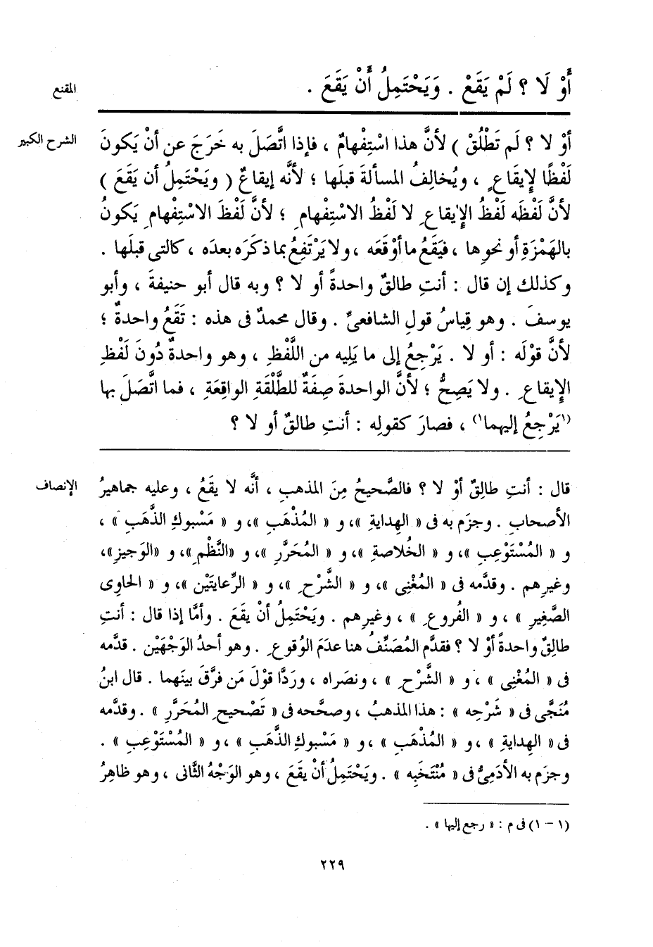 قال: أنتِ طالِقٌ أَوْ لا؟ فالصحيحُ مِنَ المذهبِ، أنَّه لا يقَعُ، وعليه جماهيرُ الأصحابِ. وجزَم به فى «الهِدايَةِ»، و «المُذْهَبِ»، و «مَسْبوكِ الذَّهَبِ»، و «المُسْتَوْعِبِ»، و «الخُلاصةِ»، و «المُحَرَّرِ»، و «النَّظْمِ»، و «الوَجيزِ»، وغيرهم. وقدَّمه فى «المُغْنِى»، و «الشَّرْحِ»، و «الرِّعايتَيْن»، و «الحاوِى الصَّغيرِ»، و «الفُروعِ»، وغيرِهم. ويَحْتَمِلُ أَنْ يقَعَ. وأمَّا إذا قال: أنتِ طالِقٌ واحدةٌ أَوْ لا؟ فقدَّم المُصَنِّفُ هنا عدَمَ الوُقوعِ. وهو أحدُ الوَجْهَيْن. قدَّمه فى «المُغْنِى»، و «الشَّرْحِ»، ونصَراه، ورَدَّا قوْلَ مَن فرَّقَ بينَهما. قال ابنُ مُنَجَّى فى «شَرْحِه»: هذا المذهبُ، وصحَّحه فى «تَصْحيحِ المُحَرَّرِ». وقدَّمه فى «الهِدايَةِ»، و «المُذْهَبِ»، و «مَسْبوكِ الذَّهَبِ»، و «المُسْتَوْعِبِ». وجزَم به الأدَمِىُّ فى «مُنْتَخَبِه». ويَحْتَمِلُ أَنْ يقَعَ، وهو الوجهُ الثَّانى، وهو ظاهِرُ