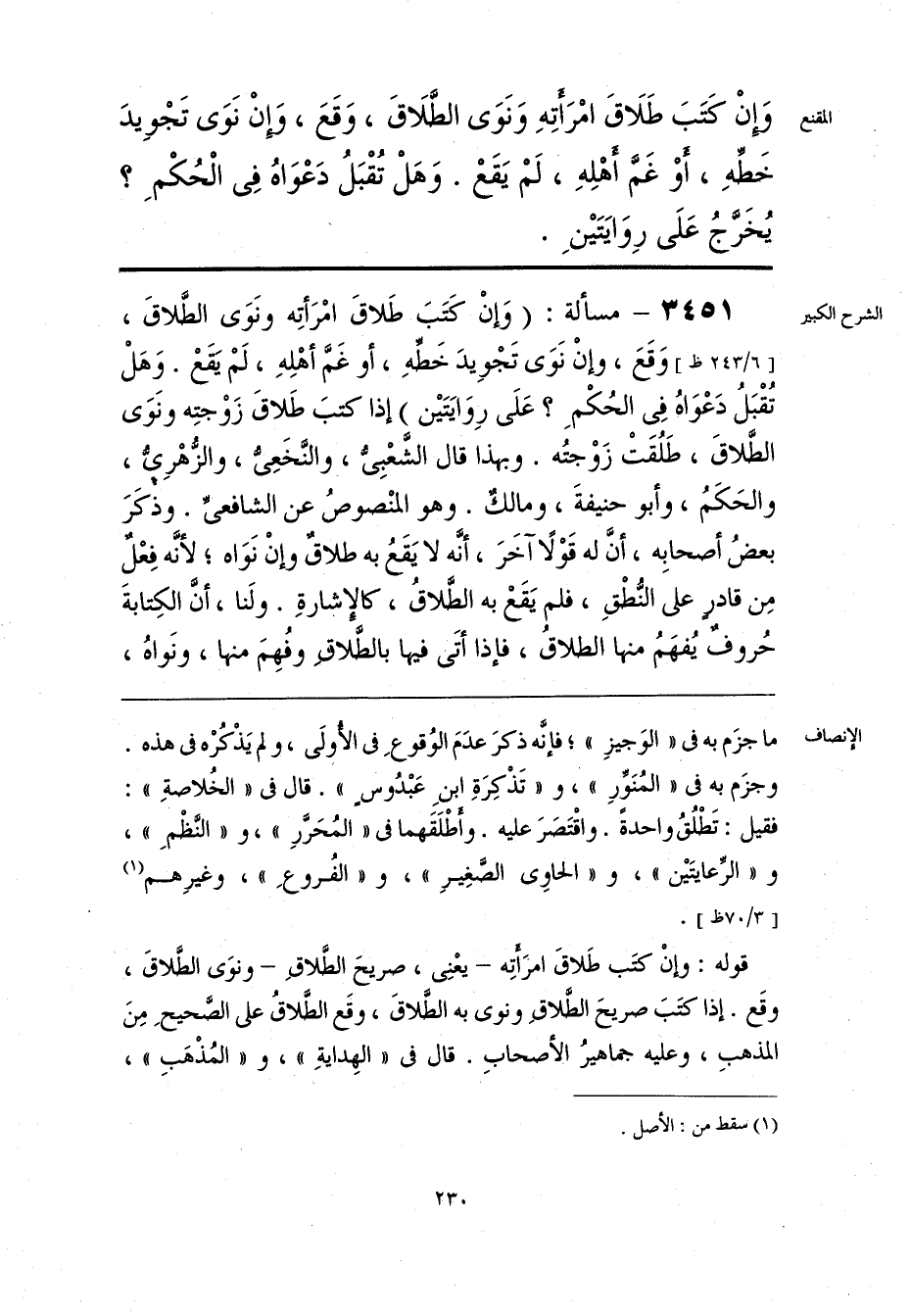 قوله: وإنْ كتَب طَلاقَ امرَأَتِه -يعْنِى، صريحَ الطَّلاقِ- ونوَى الطَّلاقَ، وقَع. إذا كتَبَ صريحَ الطَّلاقِ ونوى به الطَّلاقَ، وقع الطَّلاقُ على الصَّحيحِ مِنَ المذهبِ، وعليه جماهيرُ الأصحابِ. قال فى «الهِدايَةِ»، و «المُذْهَبِ»،