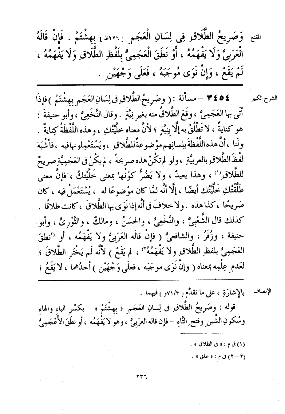 وَصَرِيحُ الطَّلَاقِ فِى لِسَانِ الْعَجَمِ بِهِشْتَمْ. فَإِنْ قَالَهُ الْعَرَبِىُّ وَلَا يَفْهَمُهُ، أَوْ نَطَقَ الْعَجَمِىُّ بِلَفْظِ الطَّلَاق وَلَا يَفْهَمُهُ، لَمْ يَقَعْ، وَإِنْ نَوَى مُوجَبَهُ، فَعَلَى وَجْهَيْنِ.