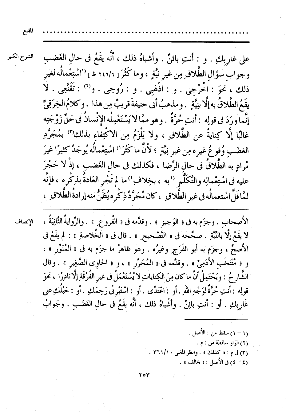 الأصحابِ. وجزَم به فى «الوَجيزِ». وقدَّمه فى «الفُروعِ». والرِّوايةُ الثَّانيَةُ، لا يقَعُ إِلَّا بالنِّيَّةِ. صحَّحه فى «التَّصْحيحِ». قال فى «الخُلاصةِ»: لم يقَعْ فى الأصحِّ، وجزَم به أبو الفَرَجِ وغيرُه. وهو ظاهرُ ما جزَم به فى «المُنَوِّرِ»، و «مُنْتَخَبِ الأَدَمِىِّ». وقدَّمه فى «المُحَرَّرِ»، و «الحاوِى الصَّغِيرِ». وقال الشَّارِحُ: ويَحْتَمِلُ أنَّ ما كان مِنَ الكِناياتِ لا يُسْتَعْمَلُ فى غيرِ الفُرْقَةِ إلَّا نادِرًا، نحوَ قولِه: أنتِ حُرَّةٌ لوَجْهِ اللَّهِ. أو: اعْتَدِّى. أو: اسْتَبْرِئى رَحِمَكِ. أو: حَبْلُكِ على غَارِبِك. أو: أنتِ بائِنٌ. وأشْباهُ ذلك، أنَّه يقَعُ فى حالِ الغَضَبِ. وجَوابُ