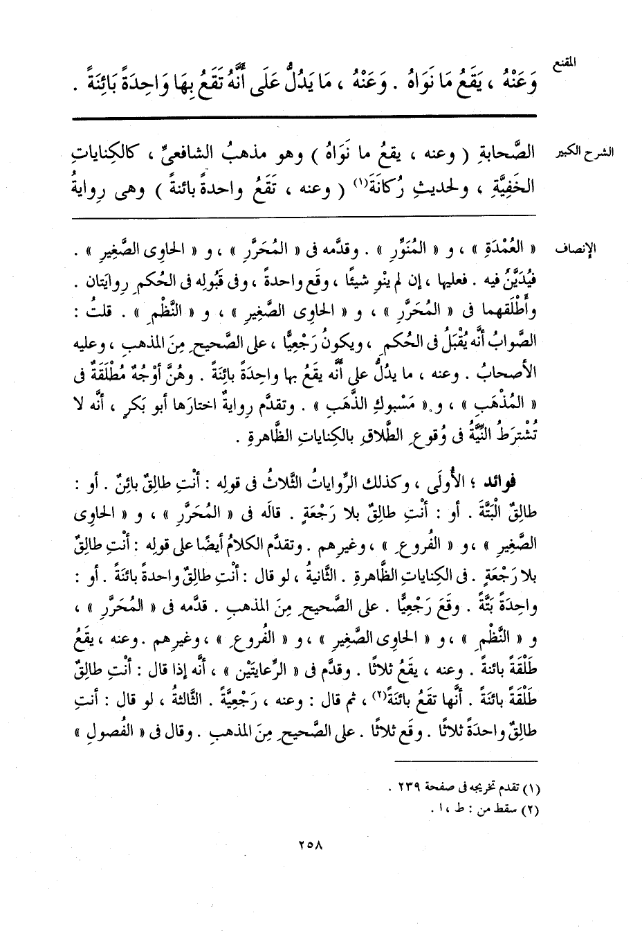 «العُمْدَةِ»، و «المُنَوِّرِ». وقدَّمه فى «المُحَرَّرِ»، و «الحاوِى الصَّغِيرِ». فيُدَيَّن فيه. فعليها، إن لم ينْوِ شيئًا، وقَع واحدةً، وفى قَبُولِه فى الحُكمِ رِوايَتان. وأَطْلَقهما فى «المُحَرَّرِ»، و «الحاوِى الصَّغِيرِ»، و «النَّظْمِ». قلتُ: الصَّوابُ أنَّه يُقبَلُ فى الحُكمِ، ويكونُ رَجْعِيًّا، على الصَّحيحِ مِنَ المذهبِ، وعليه الأصحابُ. وعنه، ما يدُلُّ على أنَّه يقَعُ بها واحِدَةً بائِنَةً. وهُنَّ أوْجُهٌ مُطْلَقَةٌ فى «المُذْهَبِ»، و «مَسْبوكِ الذَّهَبِ». وتقدَّم رِواية اختارَها أبو بَكرٍ، أنَّه لا تُشْترَطُ النِّيَّةُ فى وُقوعِ الطَّلاقِ بالكِناياتِ الظَّاهرةِ.