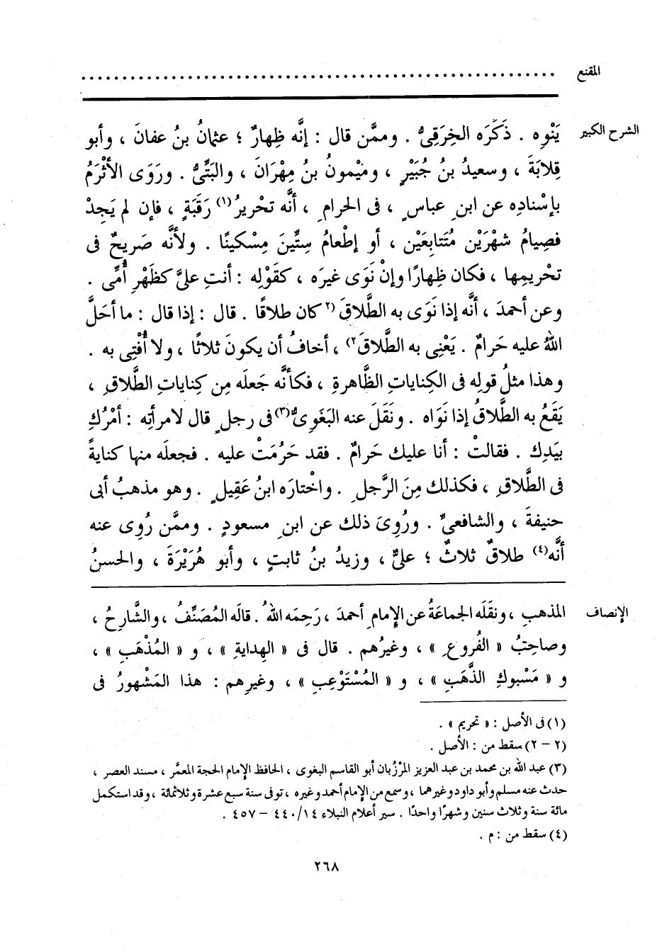 المذهبِ، ونقَلَه الجماعَةُ عن الإِمامِ أحمدَ، رَحِمَه اللَّهُ. قالَه المُصَنِّفُ، والشَّارِحُ، وصاحِبُ «الفُروعِ»، وغيرُهم. قال فى «الهِدايَةِ»، و «المُذْهَبِ»، و «مَسْبوكِ الذَّهَب»، و «المُسْتَوْعِبِ»، وغيرِهم: هذا المَشْهورُ فى