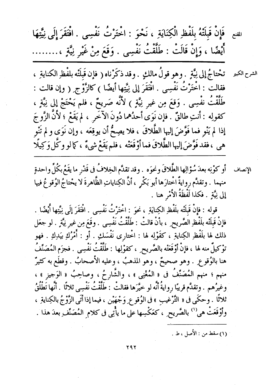 قوله: فإنْ قَبِلَتْه بلَفْظِ الكِنايَةِ، نحوَ: اخْتَرتُ نَفْسِى. افْتَقَرَ إلَى نِيَّتِها أيْضًا. فإنْ قَبِلَتْه بلَفْظِ الصَّريحِ، بأنْ قالتْ: طَلَّقْتُ نفْسِى. وقَعَ مِن غيرِ نِيَّةٍ. لو جعَل ذلك لها بلَفْظِ الكِنايةِ، كقَوْلِه لها: اخْتارِى نَفْسَكِ. أو: أمْرُكِ بيَدِكِ. فهو توْكيلٌ منه لها، فإنْ أوْقَعَتْه بالصَّريحِ، كقوْلِها: طَلَّقْتُ نَفْسِى. فجزَم المُصَنِّفُ هنا بالوُقوعِ. وهو صحيحٌ، وهو المذهبُ، وعليه الأصحابُ. وقطَع به كثيرٌ فهم؛ فهم المُصَنِّفُ فى «المُغْنِى»، والشَّارِحُ، وصاحِبُ «الوَجيزِ»، وغيرُهم. وتقدَّم قريبًا رِوايةُ أنَّه لو خيَّرَها فقالتْ: طَلَّقْتُ نَفْسِى ثلاثًا. أنَّها تَطْلُقُ ثلاثًا. وحكَى فى «التَّرْغيبِ» فى الوُقوعِ وَجْهَيْن، فيما إذا أتَى الزَّوْجُ بالكِنايةِ، وأوْقَعَتْ هى (¬1) بالصَّريحِ، كعَكْسِها على ما يأْتِى فى كلامِ المُصَنِّفِ بعدَ هذا.